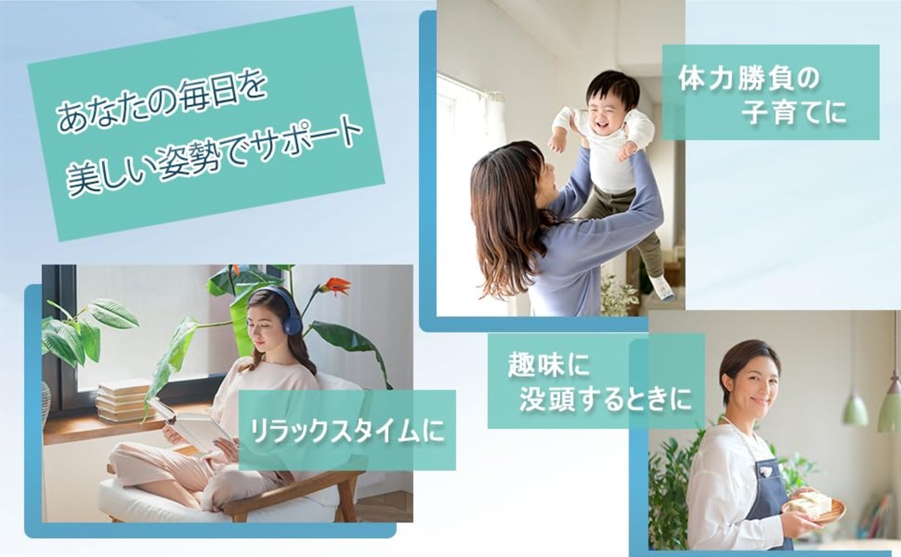 【■デスクワーク・家事・育児をしながら】服の下に装着できて目立ちにくく、オフィスや外出先でもご使用が可能。家事や育児などしながらの着用も、作業の妨げになりません。