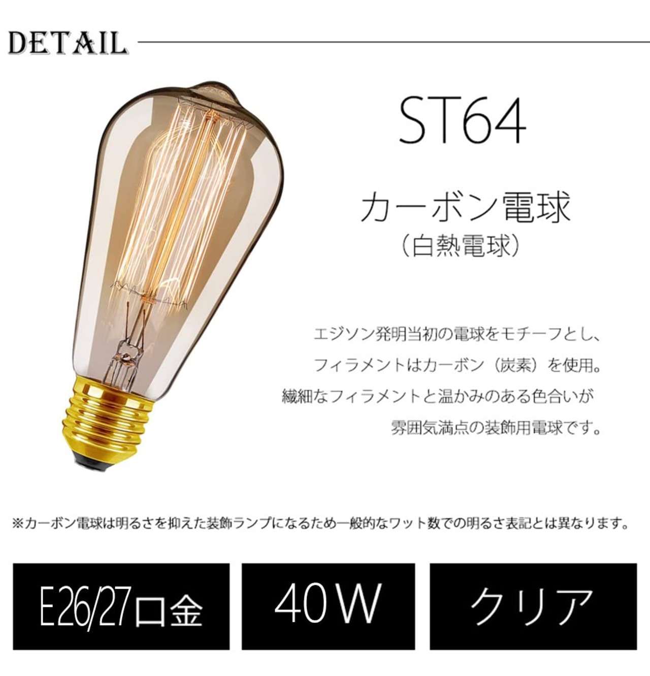 ★★★ご注意:タングステンフィラメントエジソン電球は装飾的な雰囲気を重視する電球なので、温かみのある灯りを目指し、オレンジ系の電球色の色味に設定し、明るいものではなくやや暗めなのでインテリアの一部とお考えください。生活に必要な光量はダウンライト等との併用をご検討ください。