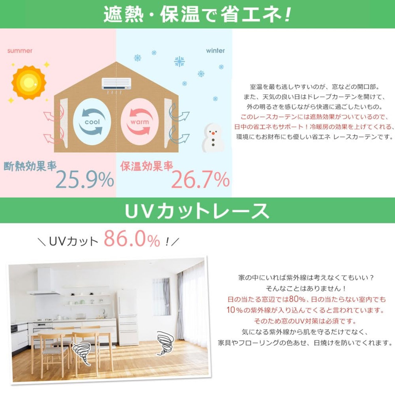 昼間も夜間も外から室内が透けにくいレースカーテンです。夏場は太陽光による室内温度の上昇を、冬場は冷気による室内の温度低下を抑える効果がある断熱ミラーレースカーテンです。