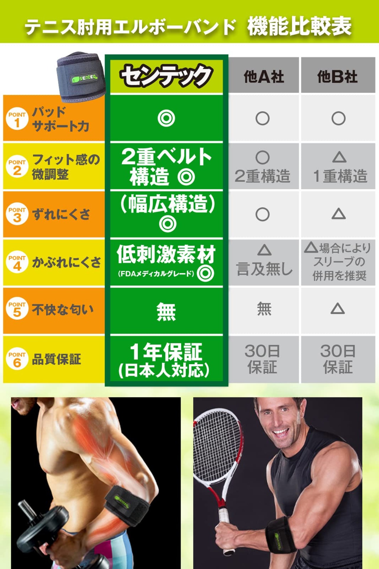 ◎センテック肘サポーターの5つの特徴◎ 1.パッドサポート力 2.フィット感の微調整が可能 3.ズレにくさ 4.肌トラブルを起こしにくい素材 5.不快な臭いがしない素材を厳選