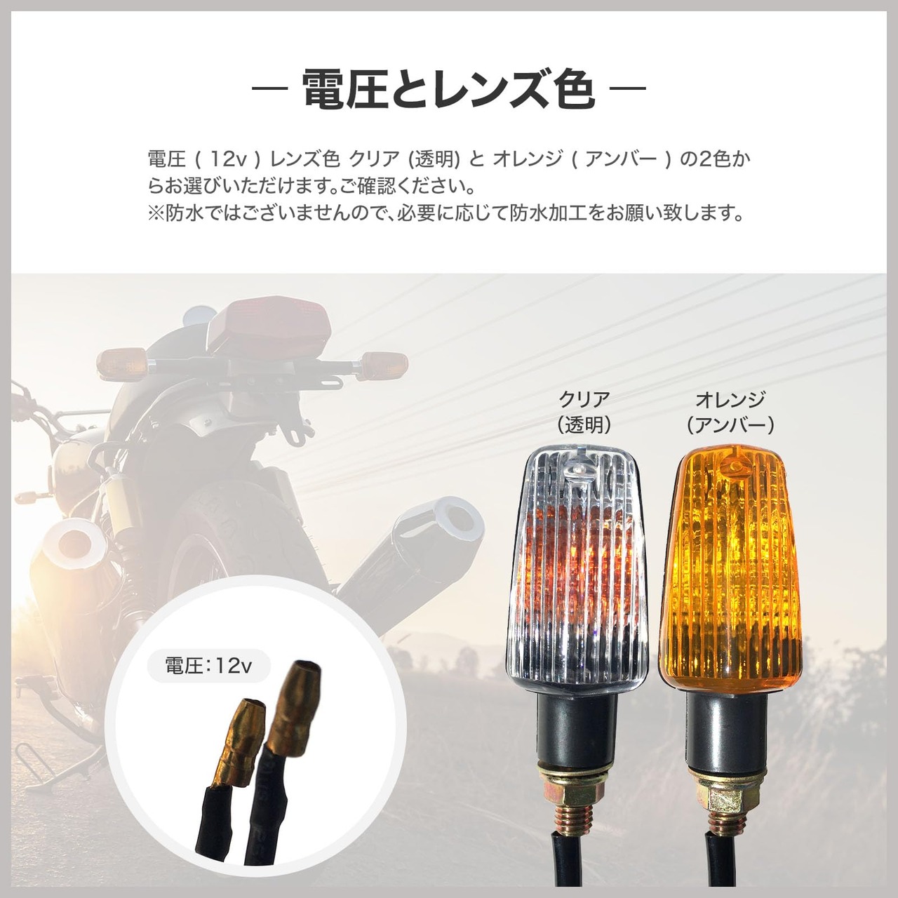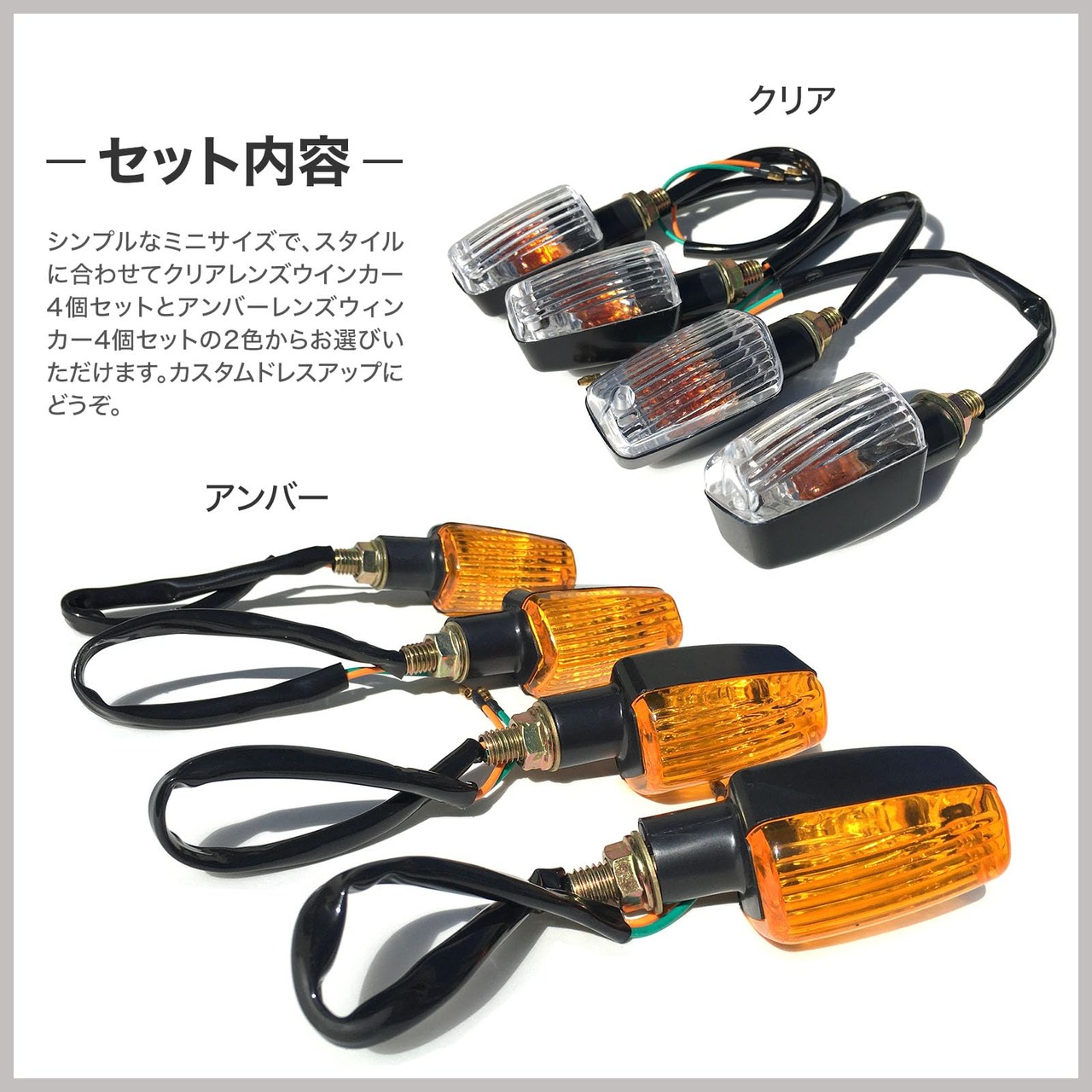 セット内容:シンプルなミニサイズで、スタイルに合わせてクリア レンズ ウインカー 4個 セットとアンバー レンズ ウィンカー 4個 セット2色からお選びいただけます。旧車のカスタム ドレスアップにもご利用いただける、バイク 汎用 ウインカーです。