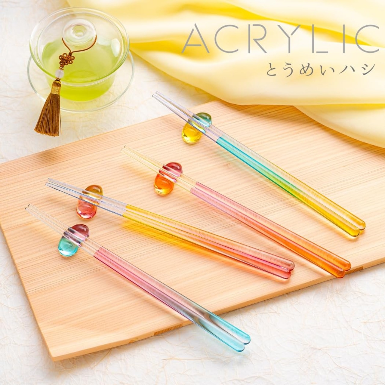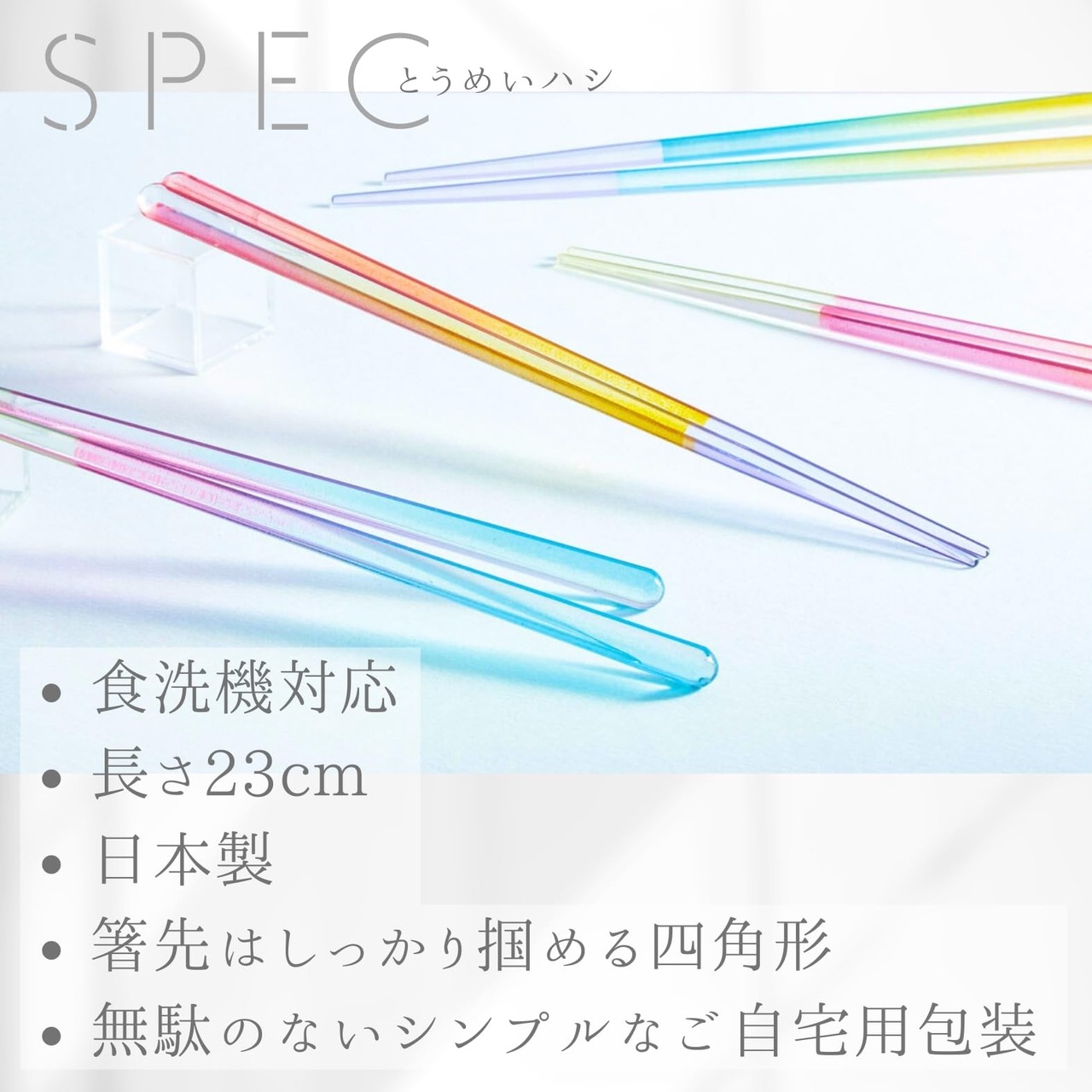 品名:とうめいハシ 材質:AS樹脂 装飾:ポリエステルウレタン塗装 箸先部:四角形状 産地:日本 サイズ: 箸:23cm お手入れ:食洗機可