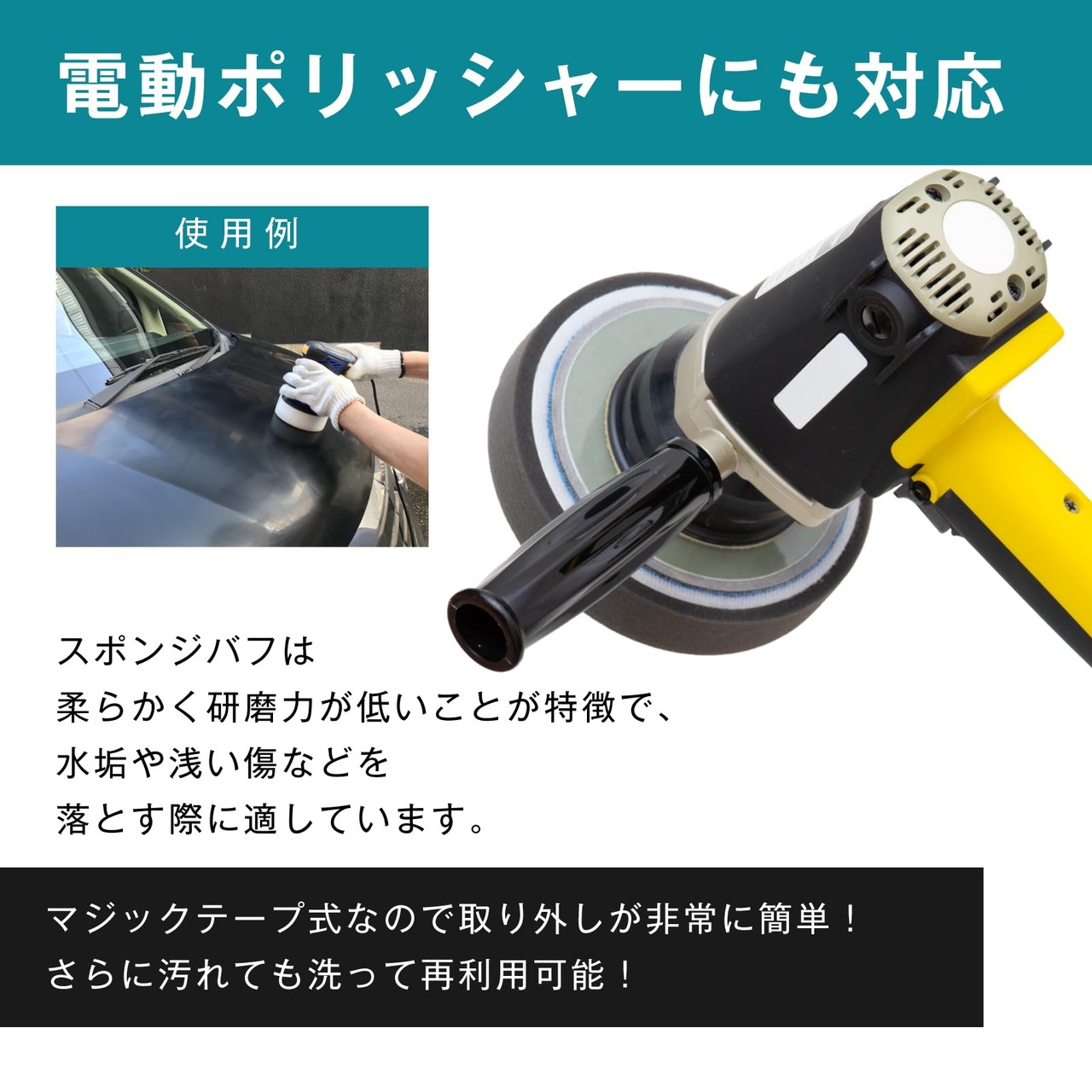 洗車等でご使用頂ける、ポリッシャースポンジです。スポンジバフは柔らかく研磨力が低いことが特徴で、水垢や浅い傷などを落とす際に適しています。弾力のある使いやすいスポンジですので、ワックスがけや研磨、艶出しにご活用頂けます。 電動ポリッシャーに取り付けてご使用頂くことも可能です。ボディの微妙な湾曲しているラインにもピッタリフィットします。 マジックテープ式なので簡単に取り外しが出来ます。さらに汚れても洗って再利用することも可能です。 洗車以外の用途でも、大きな窓ガラスやお風呂掃除などの様々なシーンでご利用いただけます。硬さを調整しやすい素材のため、用途によって目の粗さを変えることでより一層効果が発揮されます 【バリエーション】各サイズの目3個セット、又は細目中目粗目3個セット、いずれかをお選びいただけます。【サイズ】 直径約150mm、パッド部分約120mm,内径約25mm、厚み約30mm ※各商品同一サイズです。