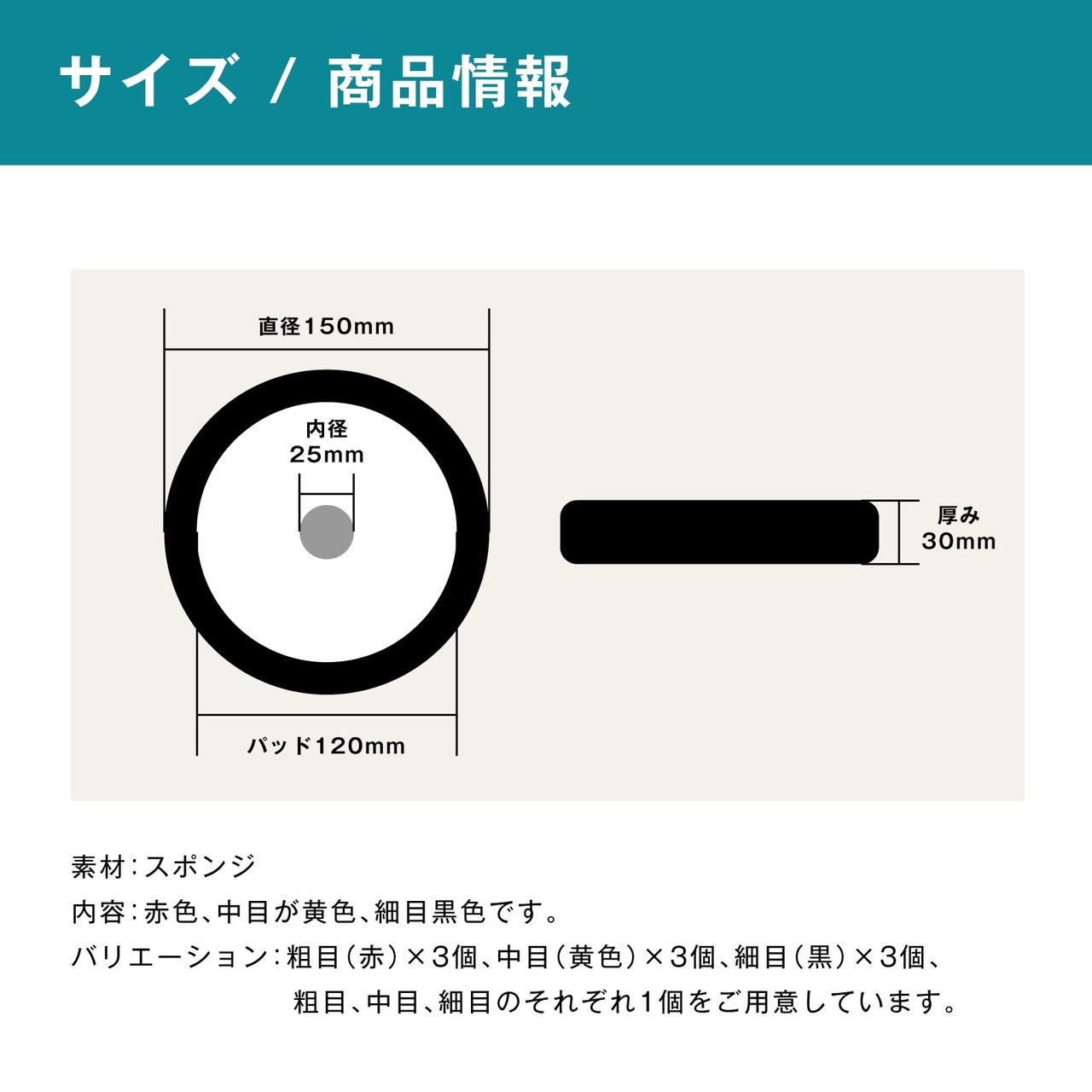 ✅【バリエーション】各サイズの目3個セット、又は細目中目粗目3個セット、いずれかをお選びいただけます。【サイズ】 直径約150mm、パッド部分約120mm,内径約25mm、厚み約30mm ※各商品同一サイズです。