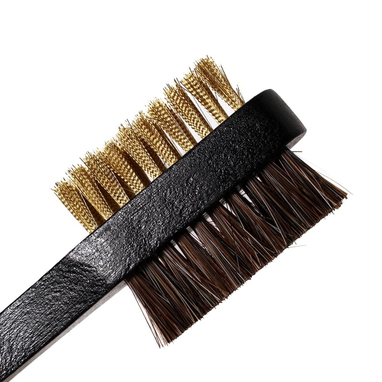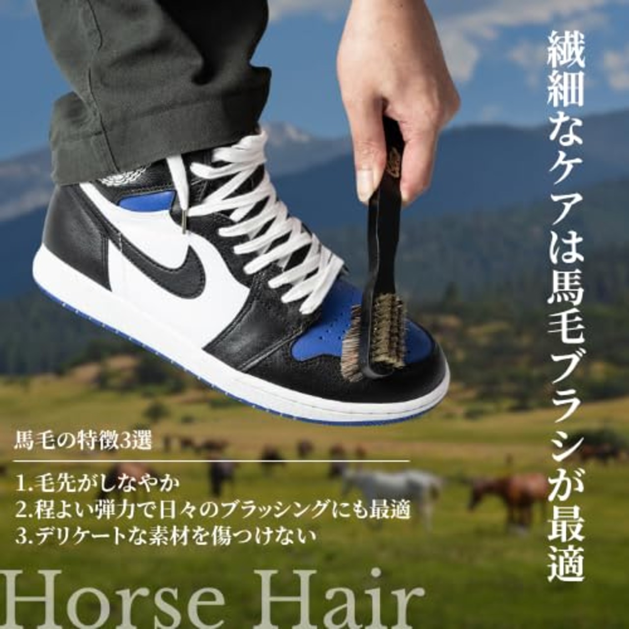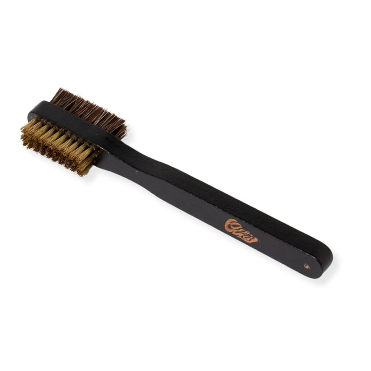 馬毛と真鍮ブラシを1つにすることで、これ1本であらゆる素材に対応する便利な2wayメンテナンスブラシ。 毛先がしなやかでほどよい弾力を持つ馬毛は、傷をつけたくないレザーやキャンバスなどの汚れ・ホコリ落としに最適。 ホコリや汚れが絡まりやすいスエードやヌバックなどの起毛革のお手入れや仕上げに最適な真鍮ブラシは、ミッドソール部分などの黒ずみ落としにも活躍。