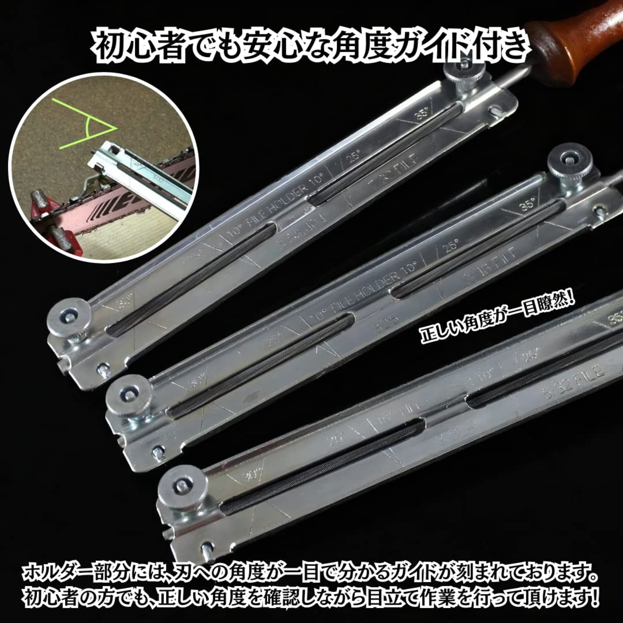 【初心者でも安心な角度ガイド!】ヤスリのホルダー部分には、チェーンソーの刃を正確に目立てする為の角度ガイドが付いております。初心者の方でも、正しい角度となっていることを確認しながら目立て作業を行って頂けるため安心です。