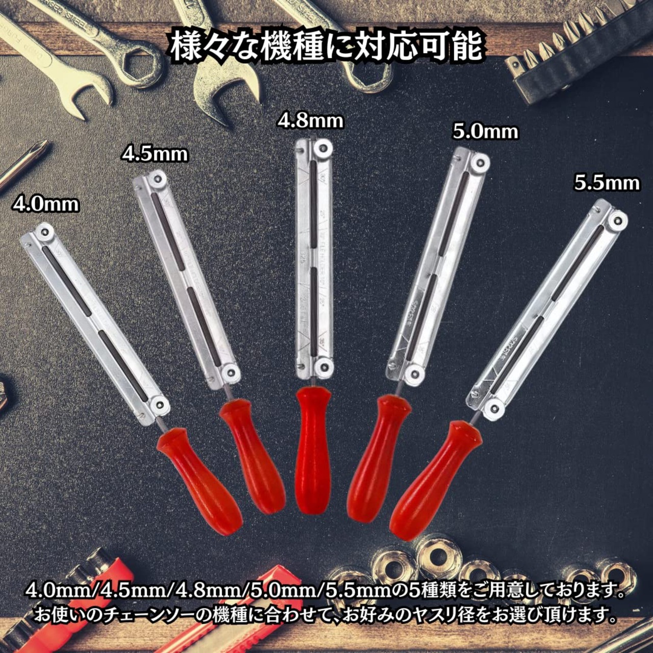 【様々な機種に対応可能】4.0mm/4.5mm/4.8mm/5.0mm/5.5mmの5種類をご用意しております。お使いのチェーンソーの機種に合わせて、お好みのヤスリ径をお選び頂けます。