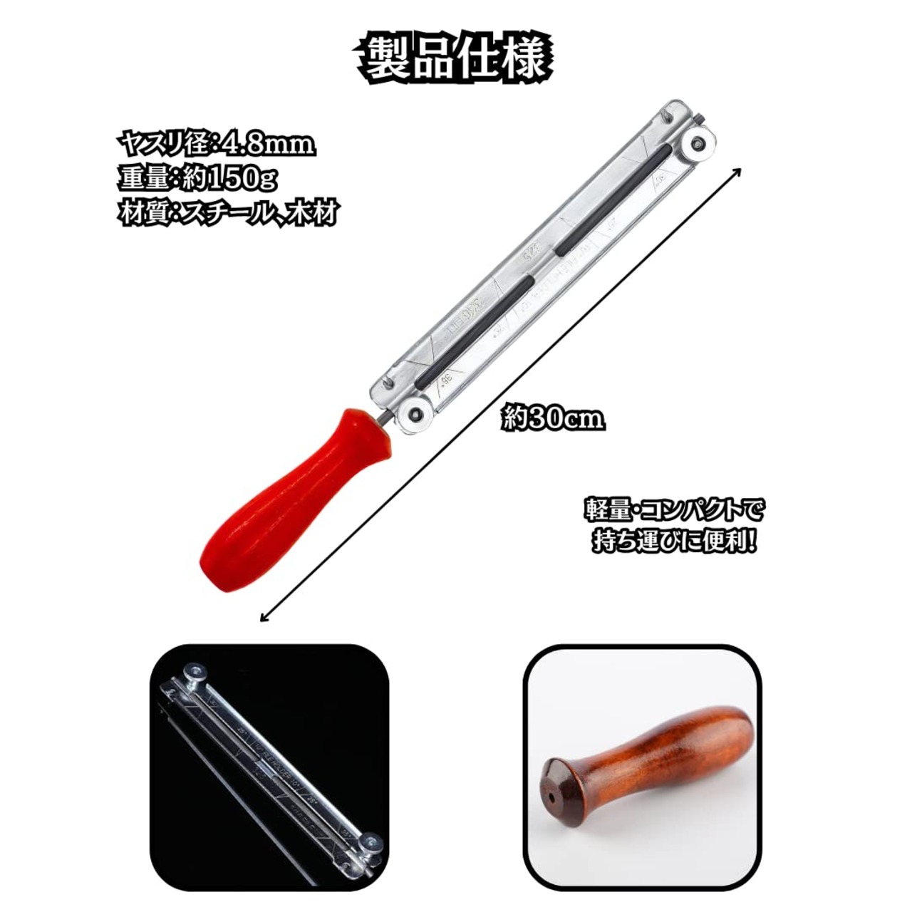 【切れ味を復活させるヤスリ!】切れ味が悪くなったチェーンソーの刃を復活させる、ホルダー付きの目立てヤスリです。切れ味の良い状態を長く維持することができるため、替刃の交換コストを節約できます。寿命だと思ったソーチェーンも、当工具で切れ味抜群に戻ること間違いなし!<br>【初心者でも安心な角度ガイド!】ヤスリのホルダー部分には、チェーンソーの刃を正確に目立てする為の角度ガイドが付いております。初心者の方でも、正しい角度となっていることを確認しながら目立て作業を行って頂けるため安心です。<br>【頑丈でしっかりとした作り】ヤスリ部分は防錆加工を施したスチール製のため、しっかりとした強度と耐久性を持ち合わせた材質となっております。また、持ち手部分は握りやすく手によく馴染む木製で、力を込めやすい作りとなっております。<br>【電池不要で軽量】片手で簡単に持てるほど軽量で、コンパクトなフォルムで持ち運びに最適です。電池や充電なども不要のため、手間なくご利用頂けます。チェーンソー作業のお供として、是非ともご携帯ください!<br>【様々な機種に対応可能】4.0mm/4.5mm/4.8mm/5.0mm/5.5mmの5種類をご用意しております。お使いのチェーンソーの機種に合わせて、お好みのヤスリ径をお選び頂けます。<br>【製品仕様】長さ:各サイズとも約30cm、重量:約150g \u203b本製品は購入から30日間の返品保証付きとなります。日本人スタッフが迅速・丁寧にご対応いたしますので、安心してお買い求めください。