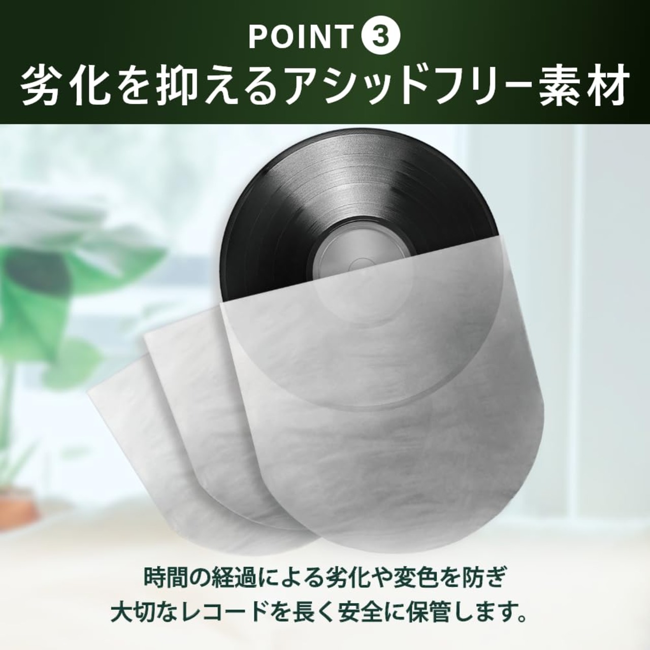 【静電気防止加工済み】静電気やホコリの付着を防ぐための静電気防止加工済み! 取り出しの際に気になる静電気を徹底ブロックし、快適さを実現しました。 さらに、埃を寄せ付けないため、レコードを汚れや劣化から守ります。