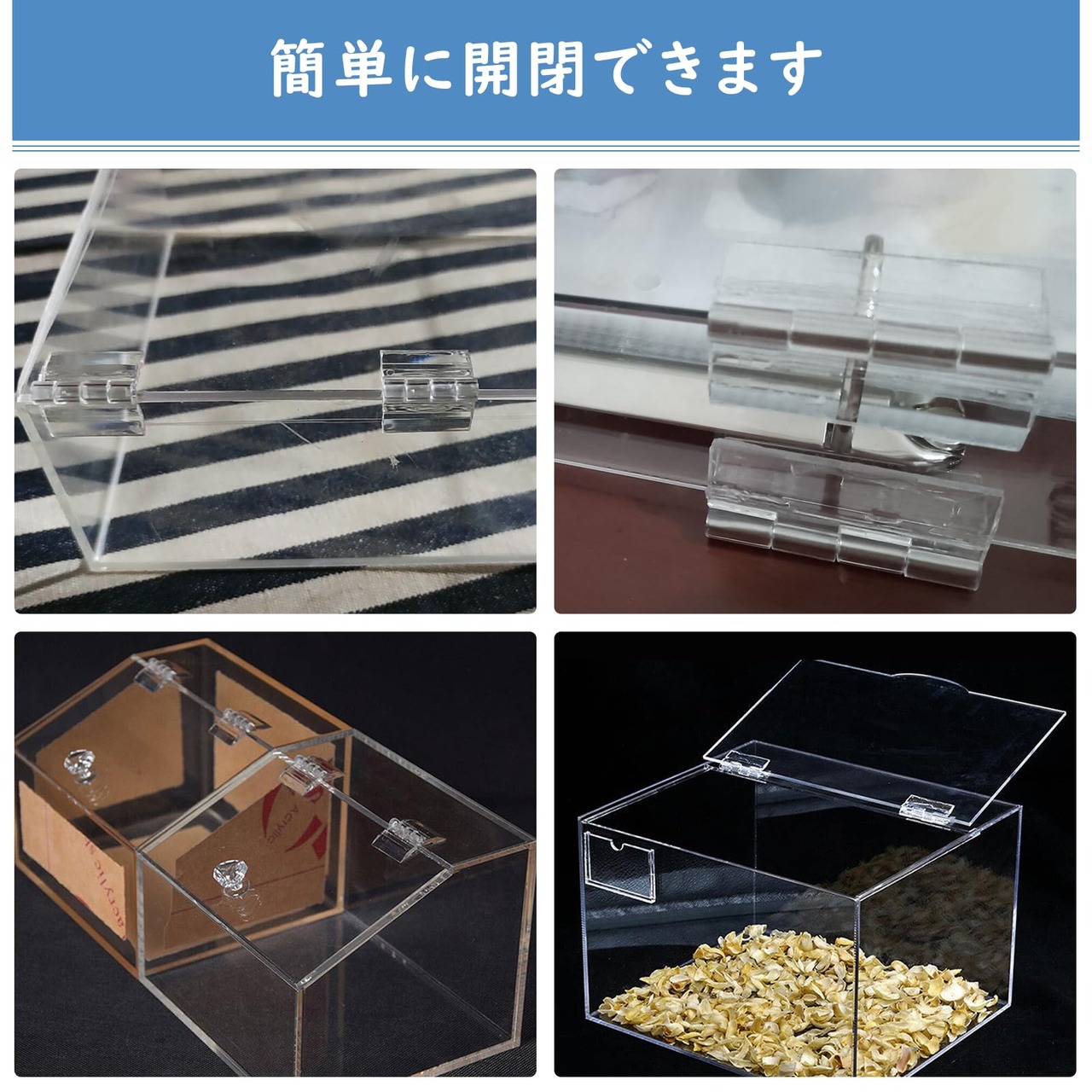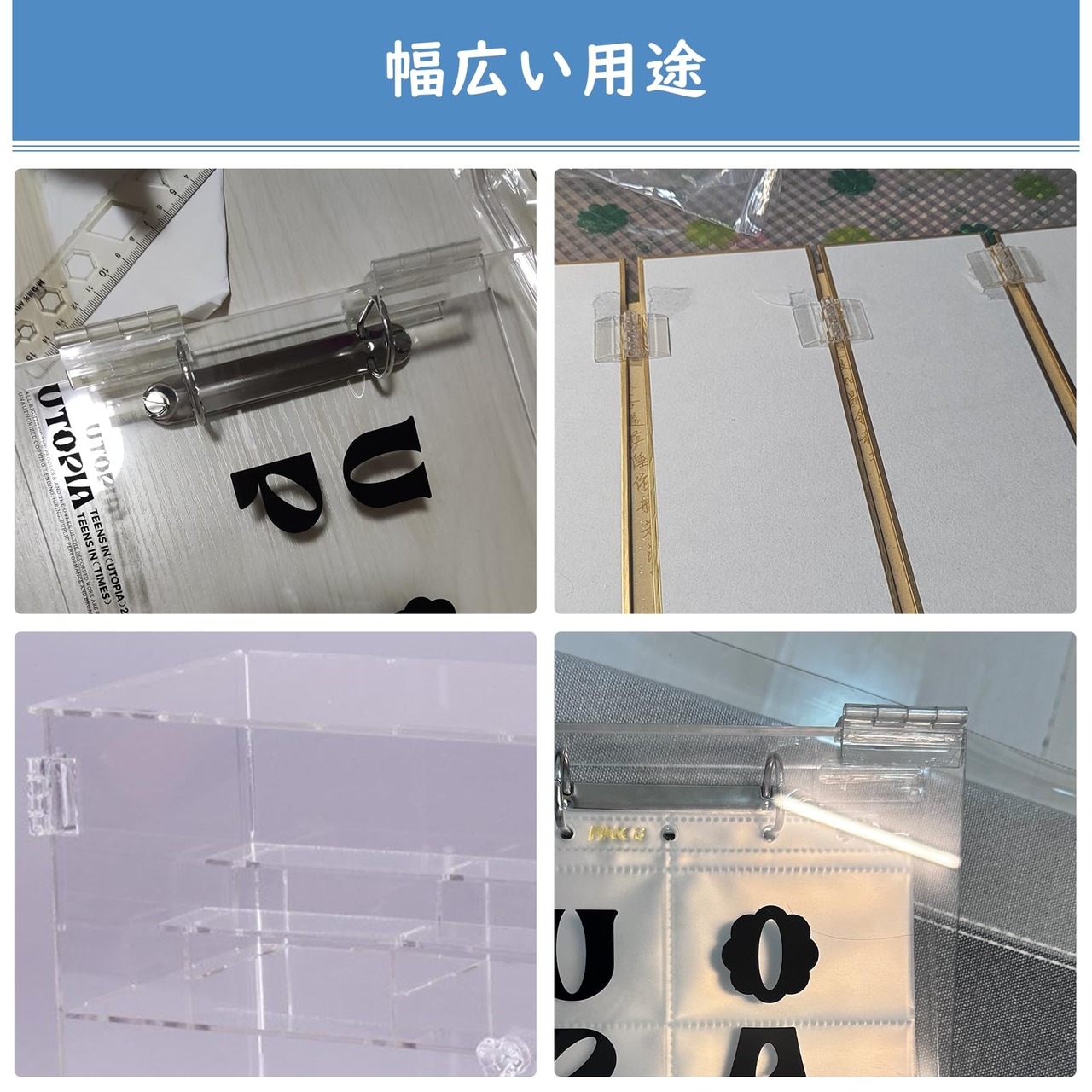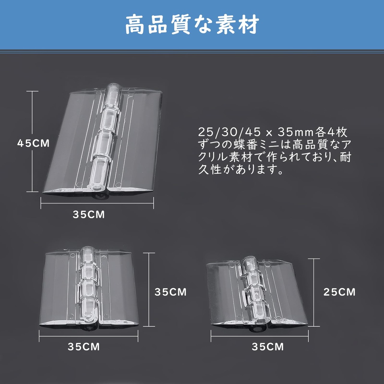 高品質な素材:25/30/45 x 35mm各4枚ずつの蝶番ミニは高品質なアクリル素材で作られており、耐久性があります。頻繁な開閉や外部環境の影響にも耐え、優れた品質とパフォーマンスを長期間にわたって提供します。