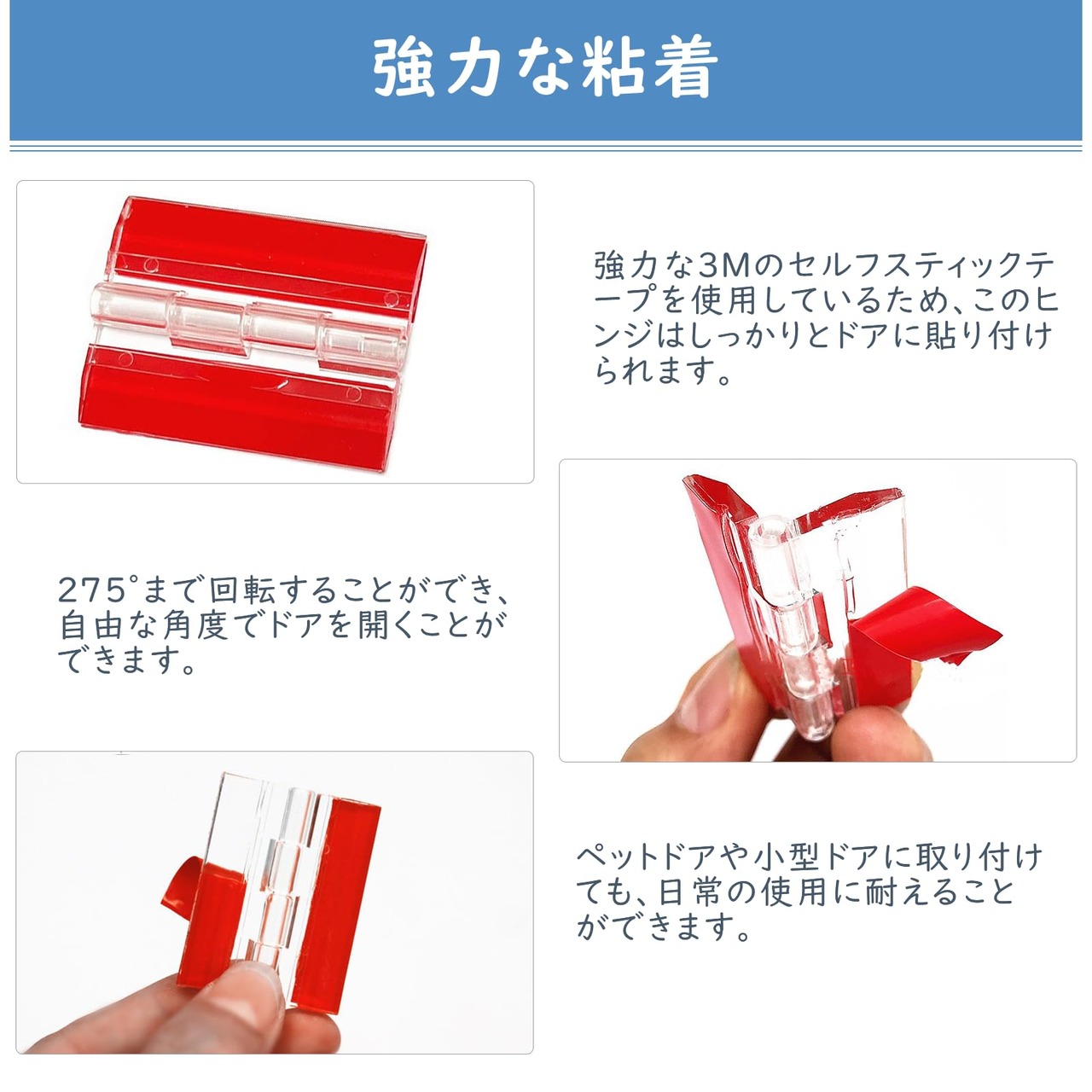 強力な粘着:強力な3Mのセルフスティックテープを使用しているため、このヒンジはしっかりとドアに貼り付けられます。ペットドアや小型ドアに取り付けても、日常の使用に耐えることができます。