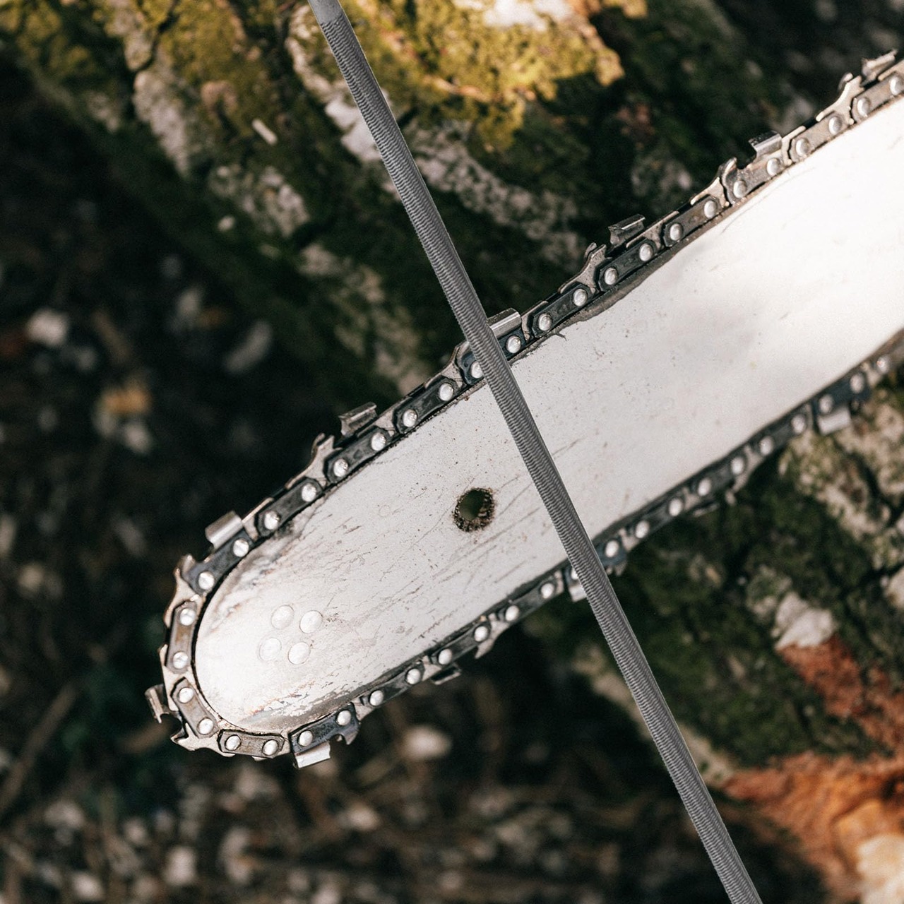 注意: チェーンソーチェーン丸やすりを使用するときは、怪我を避けるために常に手袋やゴーグルなどの安全具を着用してください。