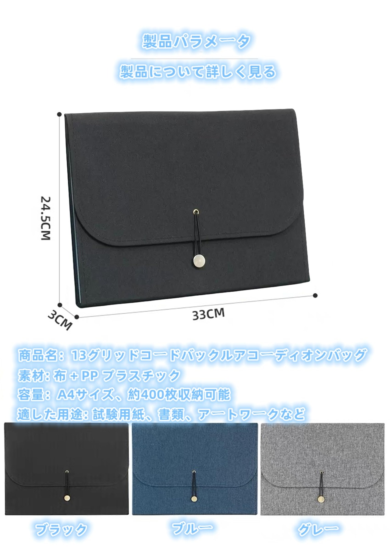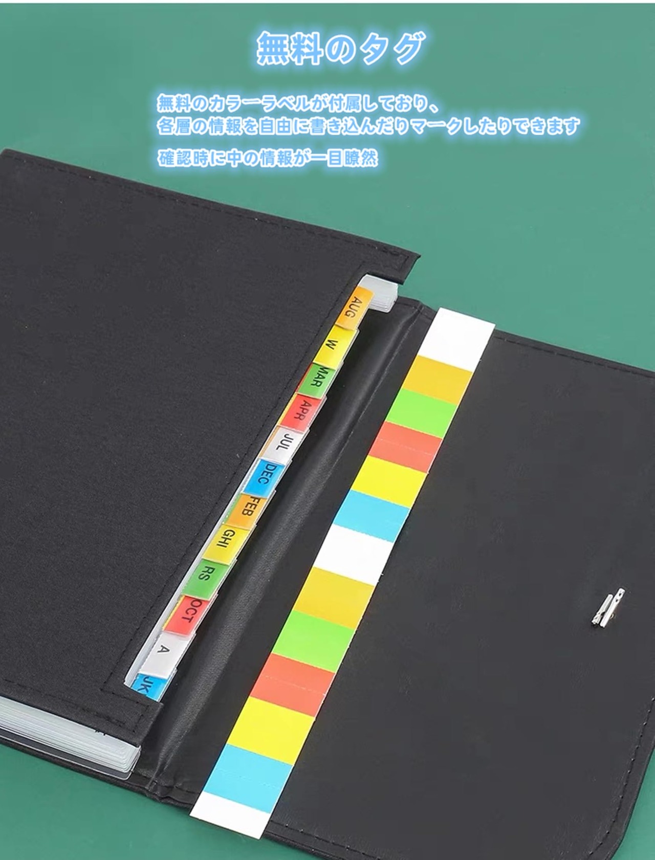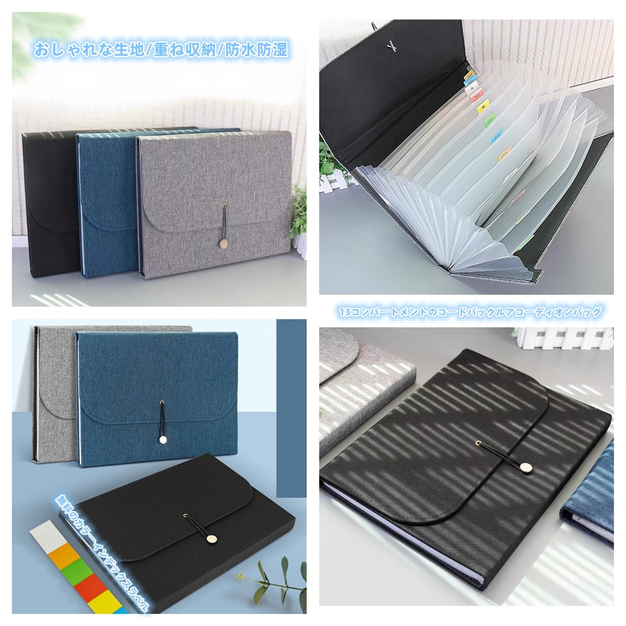 製品詳細<br> 素材:布製PPプラスチック<br> シートサイズ:レター、A4<br> このフォルダーは、商業的な機会、オフィス文書の保管、家庭用文書の保管、就職の面接、学校などに適しています。<br> 旅行や会議など普段使いにも適した薄型フォルダーです。<br> この美しくユニークなファイルフォルダーは実用的なので、友人、教師、同僚、顧客、パートナーへの素晴らしい贈り物です。<br> 書類をよく使う人に最適なA4 ドキュメントファイル 束になったクリアファイルでは書類が見つけにくい・・・、プリントが曲がってる・・・、留めていたクリップが他の資料に引っかかって取れた・・・etc。GEMZISのドキュメントファイル 書類収納ケースを使うことでこのような煩わしさから解放されます。書類をきっちり分類し、クリアファイルもそのまま収納可能。書類をまとめて持ち運びでき、お目当ての書類をすぐに取り出すことができます。あの資料を持ったっけ?がなくなる安心感をぜひ味わってください。<br> 今までになかった高級感のあるハードカバー製 今までの書類ケースのイメージを覆すそのシンプルでクールなデザインはさまざまなシーンで好印象を与えることができます。一般的な全面ポリプロピレン(PP)製のドキュメントファイルと比較し高い耐久性を誇るハードカバーは防水性能も備えています。ワンタッチで開閉できるストラップにより、書類が多くてボタンを留められないということもありません。スマートに書類の出し入れが可能です。<br> &nbsp;使うシーンを選ばないユニセックスデザイン 持ち運びに特化したスリムタイプのデザインなのにしっかり書類を収納できます。サイズは約33cm x 24.5cm x 3cm。収納力を確保しながらも厚みを抑え引っかかりなくカバンへも出し入れできます。洗練されたユニセックスデザインの外観により、営業や学校のプリントの収納などシーンを選ばずお使いいただけます。毎日使う書類ケースだからこそいい物を使いたい方にぴったりの製品です。<br> すぐに見つかる!書類をスマートに出し入れ可能な仕切り スリムタイプなのにしっかりと開くことのできるアコーディオンタイプのじゃばら仕切りにより、目的の書類を素早く見つけることができます。13ポケットあるので12月別+アルファで整理したり、会議や授業別に合わせて書類を分類できます。 また本製品にはカラフルなインデックススリットを付属しています。付け替え可能なので分類用途が変わっても目的に応じてインデックスを整理できます。裏面は平らな構造になっているので、膝の上でバインダーがわりに書類に書き込むことも可能。プレゼン資料やテキストなど持ち物が多い学生にもぴったりです。<br> 細部のこだわりのロールアップ構造。A4クリアファイルも入るサイズと高い耐久性 仕切りはしっかりした厚みがあるのでペラペラして書類を入れにくいということもありません。また、ファイルポケット上部のエッジ部分はロールアップ構造により耐久性を高め手を切ったりケガの心配もありません。A4サイズのプリントやA4クリアファイルを折りたたまずにきれいに収納できます。
