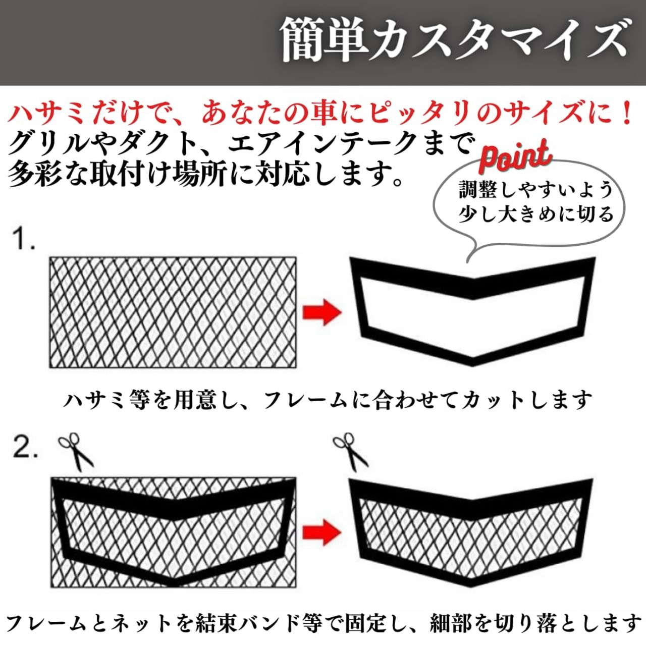 【簡単カスタマイズ】ハサミだけで、あなたの車にピッタリのサイズに調整可能。グリルやダクト、エアインテークまで、多彩な取付け場所に対応します。