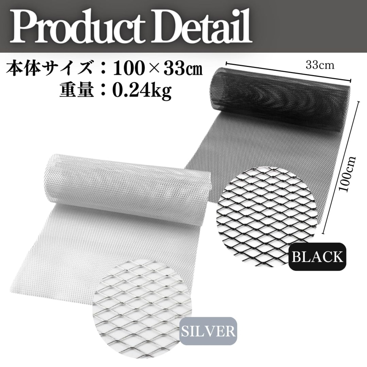 【愛車の魅力を引き出す】フロントグリルのカスタムは、車の印象を大きく変える鍵。アルミ製のメッシュネットで、耐久性とスタイリッシュなデザインを手に入れ、あなたの車を一段と引き立てます。 【高品質アルミ合金製】素材は耐食性・防水性を兼ね備えたアルミニウム合金製。鉄製と異なり錆にも強いため長寿命で耐久性抜群なので飛び石やゴミ等からの保護にも最適! 【簡単カスタマイズ】ハサミだけで、あなたの車にピッタリのサイズに調整可能。グリルやダクト、エアインテークまで、多彩な取付け場所に対応します。 【商品サイズ】選べる編み目は4サイズ・4x8mm/6x12mm/8x16mm/10x20mm 本体サイズ:100×33cm 重量:0.24kg カラー:ブラック/シルバーの2色展開