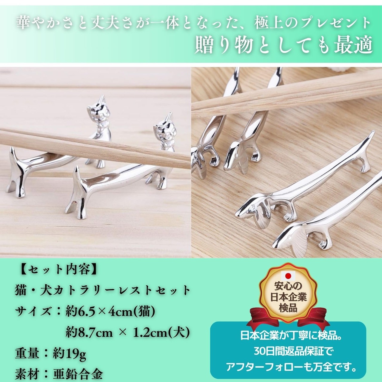 【可愛らしい犬猫デザインのシルバー箸置きセット!】食卓を彩るおしゃれで実用的なアクセントにおすすめのカトラリーレストです。使いやすく、シルバーは愛用できる亜鉛合金製。おうち時間やホームパーティーにもピッタリのセットで贈り物にも最適です!
