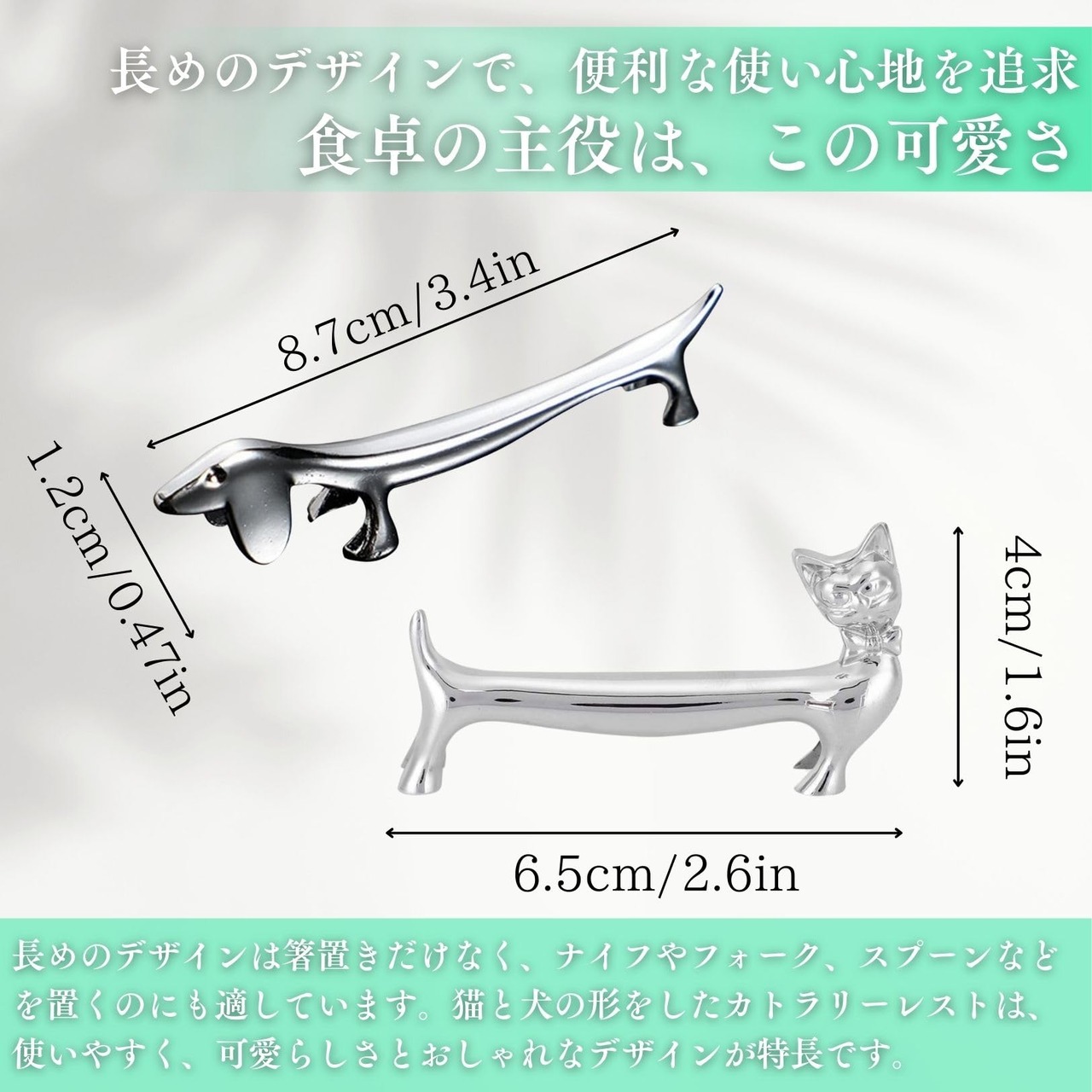 【長めのデザインで、便利な使い心地を追求。食卓の主役は、この可愛さ】長めのデザインは全長約9cmで、箸置きだけなく、ナイフやフォーク、スプーンなどを置くのに適しています。猫と犬の形をしたカトラリーレストは、使いやすく、可愛らしさとおしゃれなデザインが特長です。