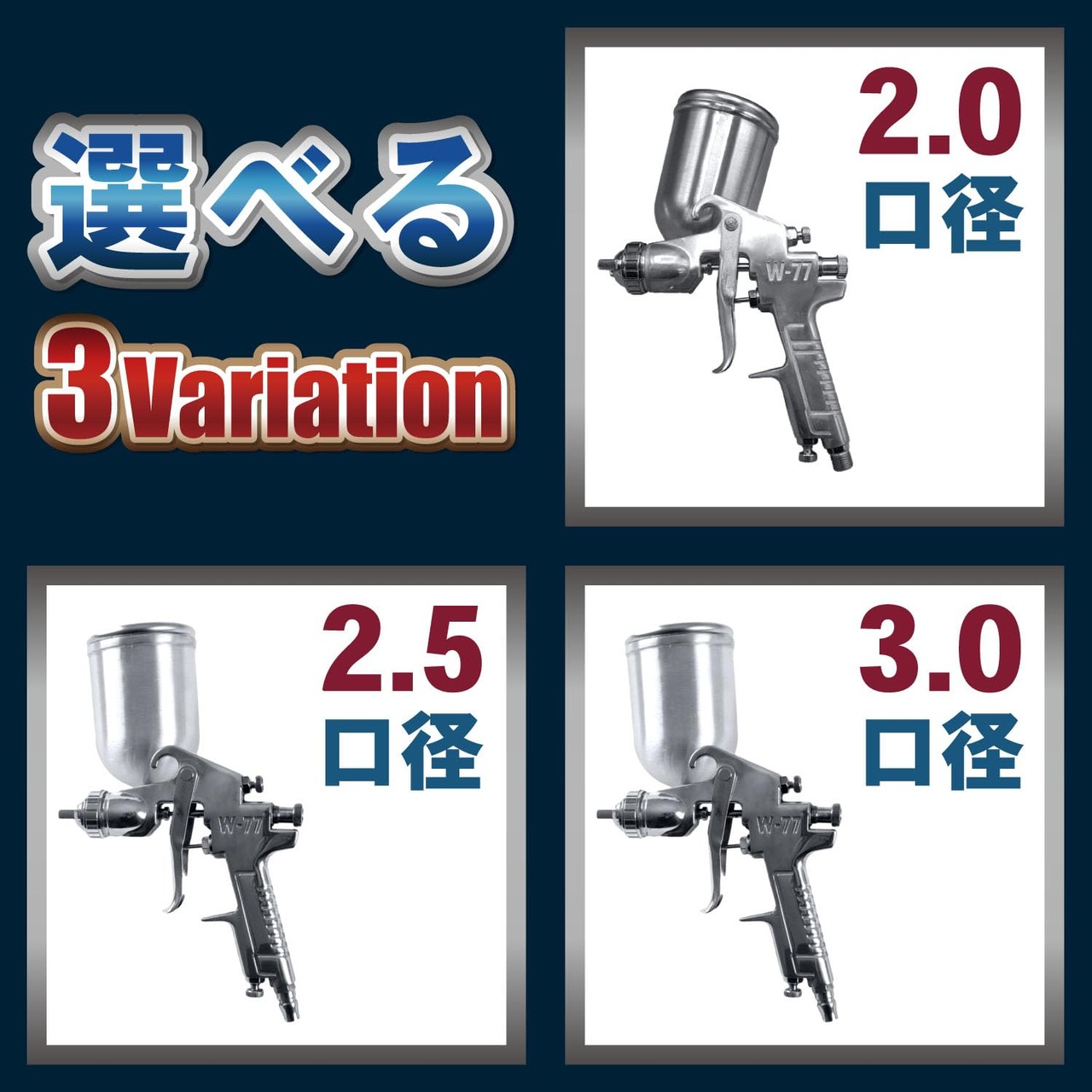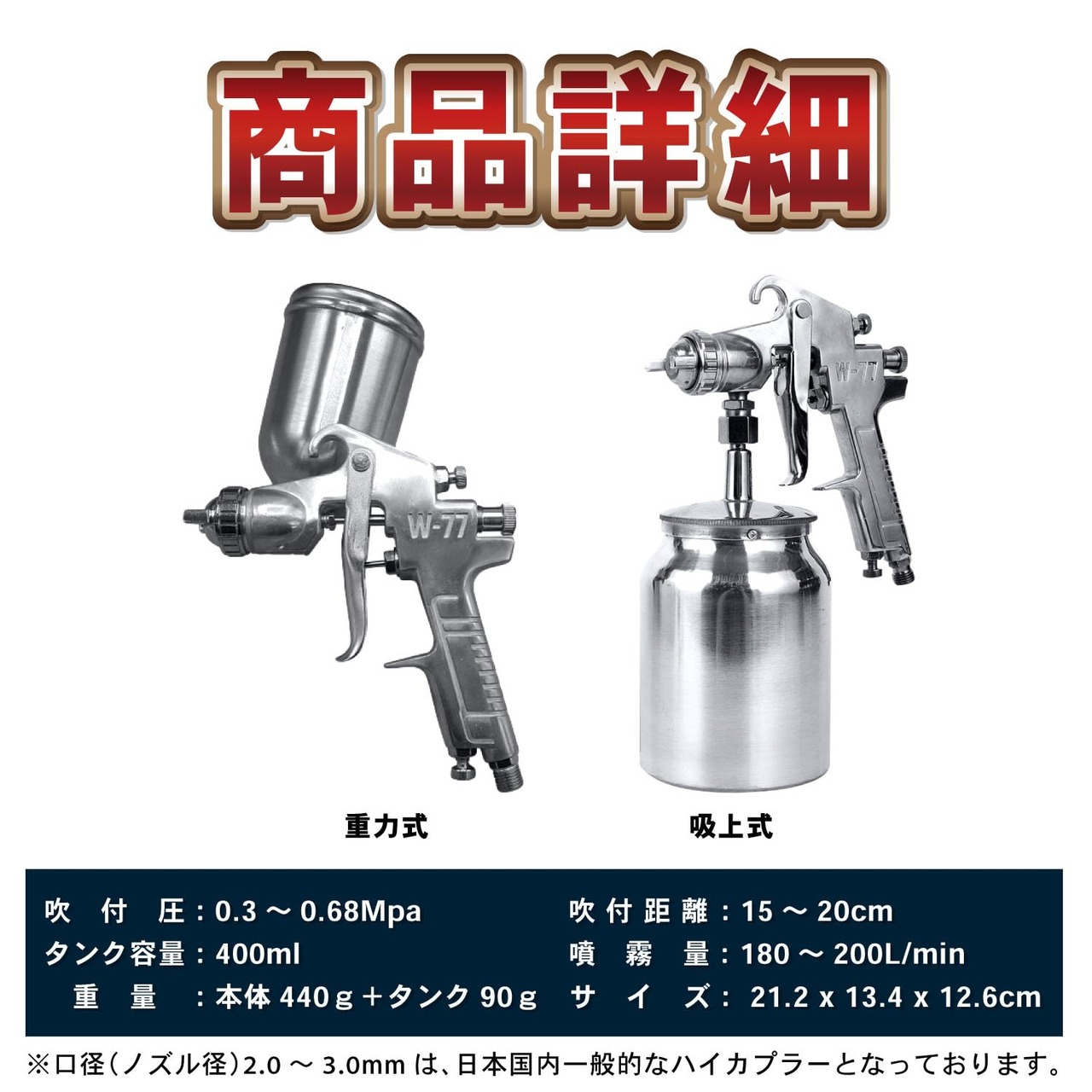 W-77 重力式 塗装スプレーガンは、口径(ノズル径)2.0~3.0mmの範囲で、国内一般的なハイカプラーに対応しています。高品質なアルミ合金製で頑丈かつ耐久性があり、安全にお使いいただけます。
