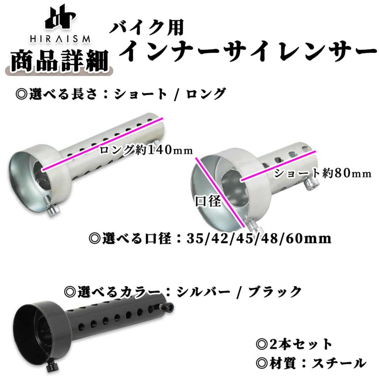 【商品内容】入数:2本セット <口径サイズ> 35 / 42 / 45 / 48 / 60 mm <全長> ロング:140mm ショート:80mm <カラー> シルバー / ブラック <材質> スチール