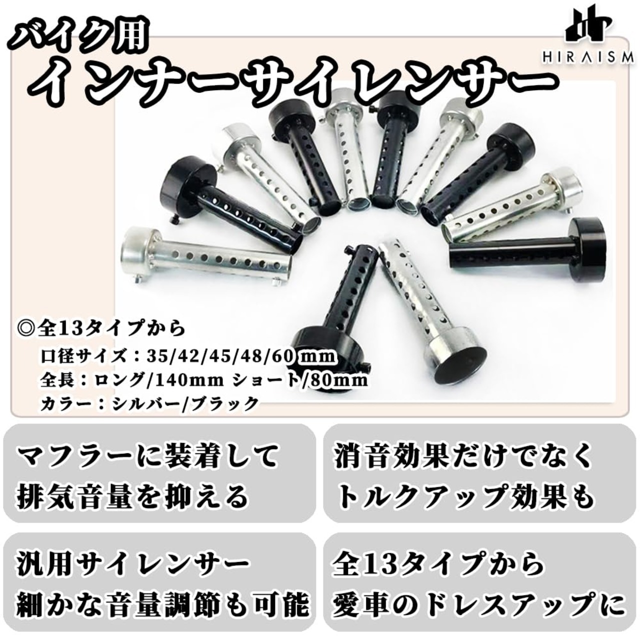 【商品内容】入数:2本セット <口径サイズ> 35 / 42 / 45 / 48 / 60 mm <全長> ロング:140mm ショート:80mm <カラー> シルバー / ブラック <材質> スチール  【汎用 インナーサイレンサー】バイクのマフラー(エキパイ)へ取り付けることで、排気音量を抑えることができる バイク用 インナーサイレンサー です。排気音量を下げることで騒音問題も軽減し、低速回転時には若干のトルクアップも期待できます。汎用ストレートタイプで、ネイキッド、アメリカン、クラシック、旧車など多くの車種に適合します。 【取り付け簡単】マフラーに取り付け用のボルト穴があれば、ボルトオンで簡単に装着できます。また、中蓋の位置を調整することで、細かな音量調節も可能になっております。必要に応じてグラスウールなどを併用ください。※取り付け穴がない場合はマフラー側に穴あけ加工が必要になります。 【全13タイプから選択可能】ロングタイプとショートタイプの合計13種類から、お好みやバイクのスタイルに合わせて最適なものをお選びいただけます。※輸送時の細かいスレ・汚れがある場合がございます。※当商品には取付レンチ、グラスウールは付属しておりません。
