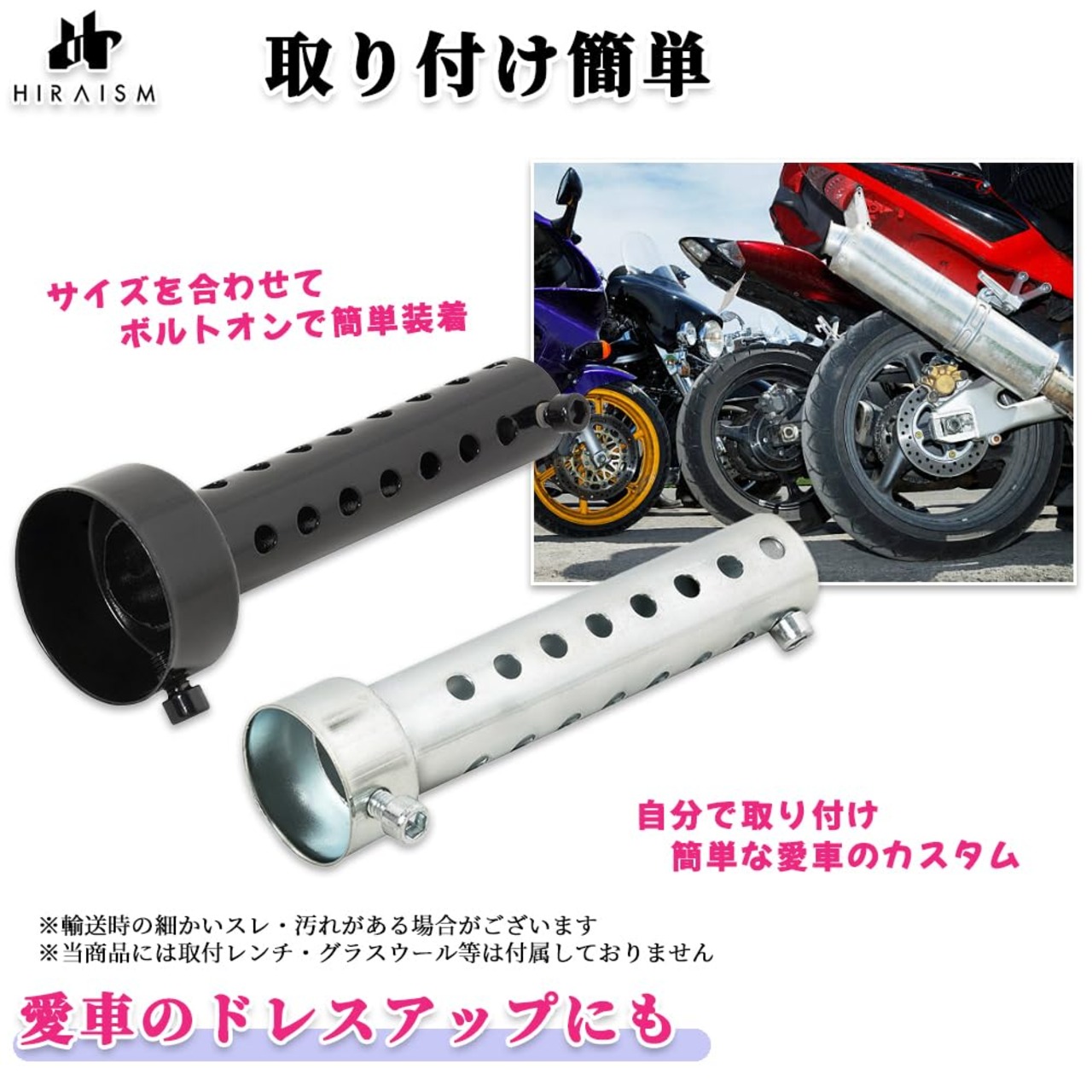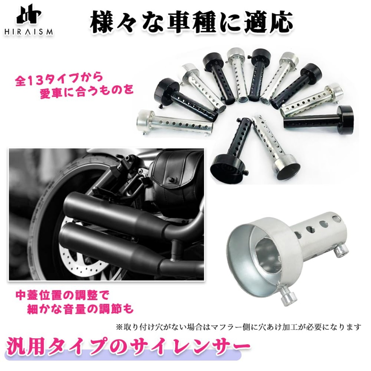 【全13タイプから選択可能】ロングタイプとショートタイプの合計13種類から、お好みやバイクのスタイルに合わせて最適なものをお選びいただけます。※製造上の都合で、どうしても細かい傷やスレができてしまう場合がございます。(商品は新品であり、機能としても問題ございませんのでご安心ください) ※当商品には取付レンチ、グラスウールは付属しておりません。