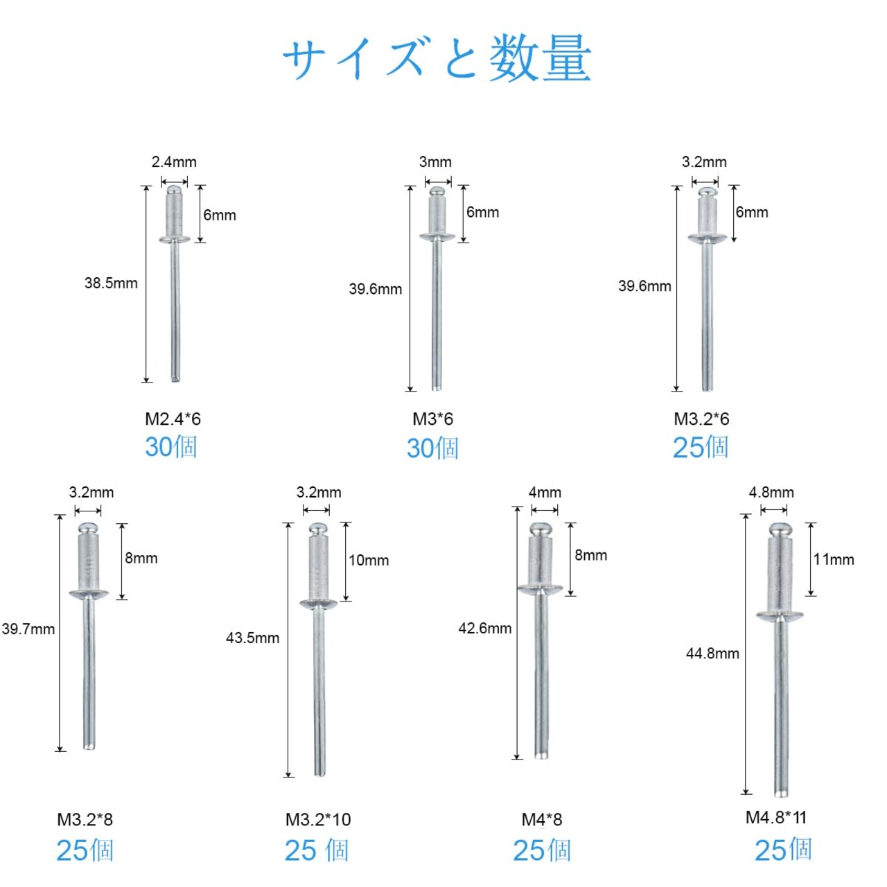 【190個リベット セット 仕様】M2.4*6mm(30個)、 M3*6mm(30個)、M3.2*6mm(25個)、M3.2*8mm(25個)、M3.2*10mm(25個)、M4*8mm(25個)、M4.8*12mm(25個)。ネジ (5個)、収納ボックスを無料でご用意しております,外出時の持ち運びや管理が簡単です。さまざまな仕様がさまざまなニーズに対応します。