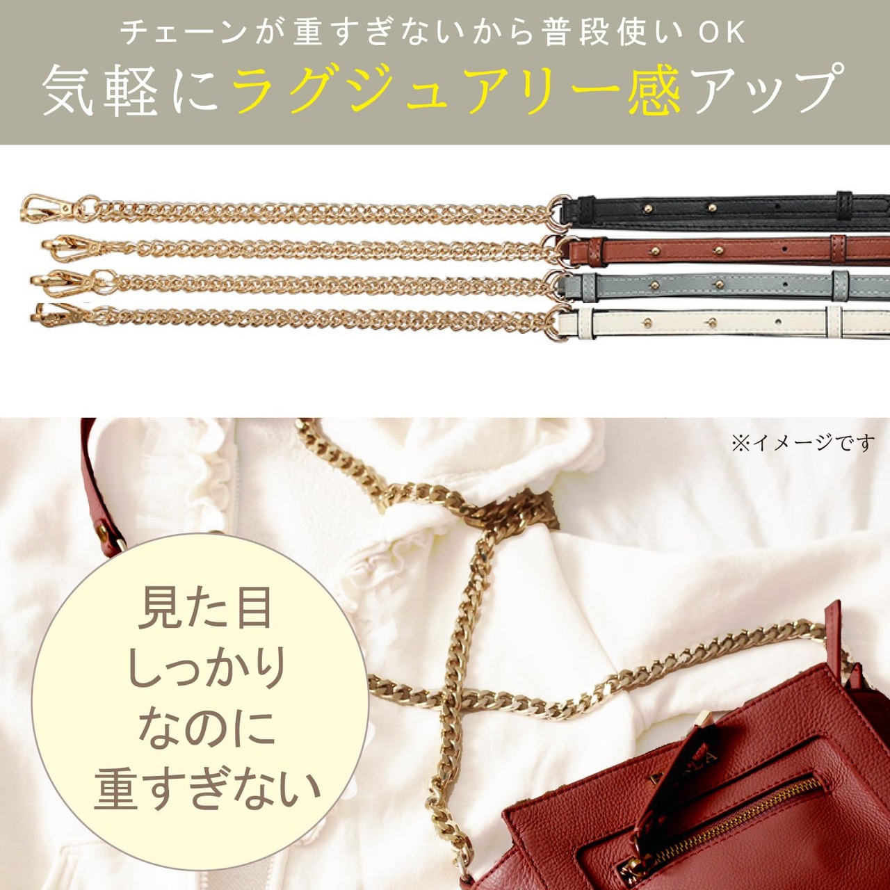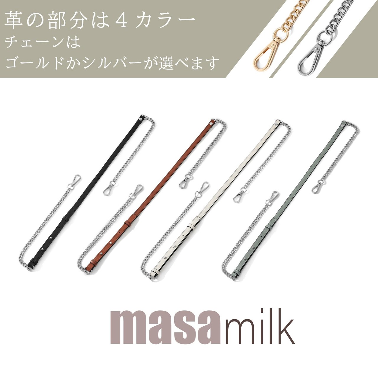 【選べる4カラー×2】ベルトの色はブラック・ブラウン・グレー・ホワイトの4カラー。チェーンはゴールドとシルバーの2種。お手持ちのバッグに合わせてお選びください。