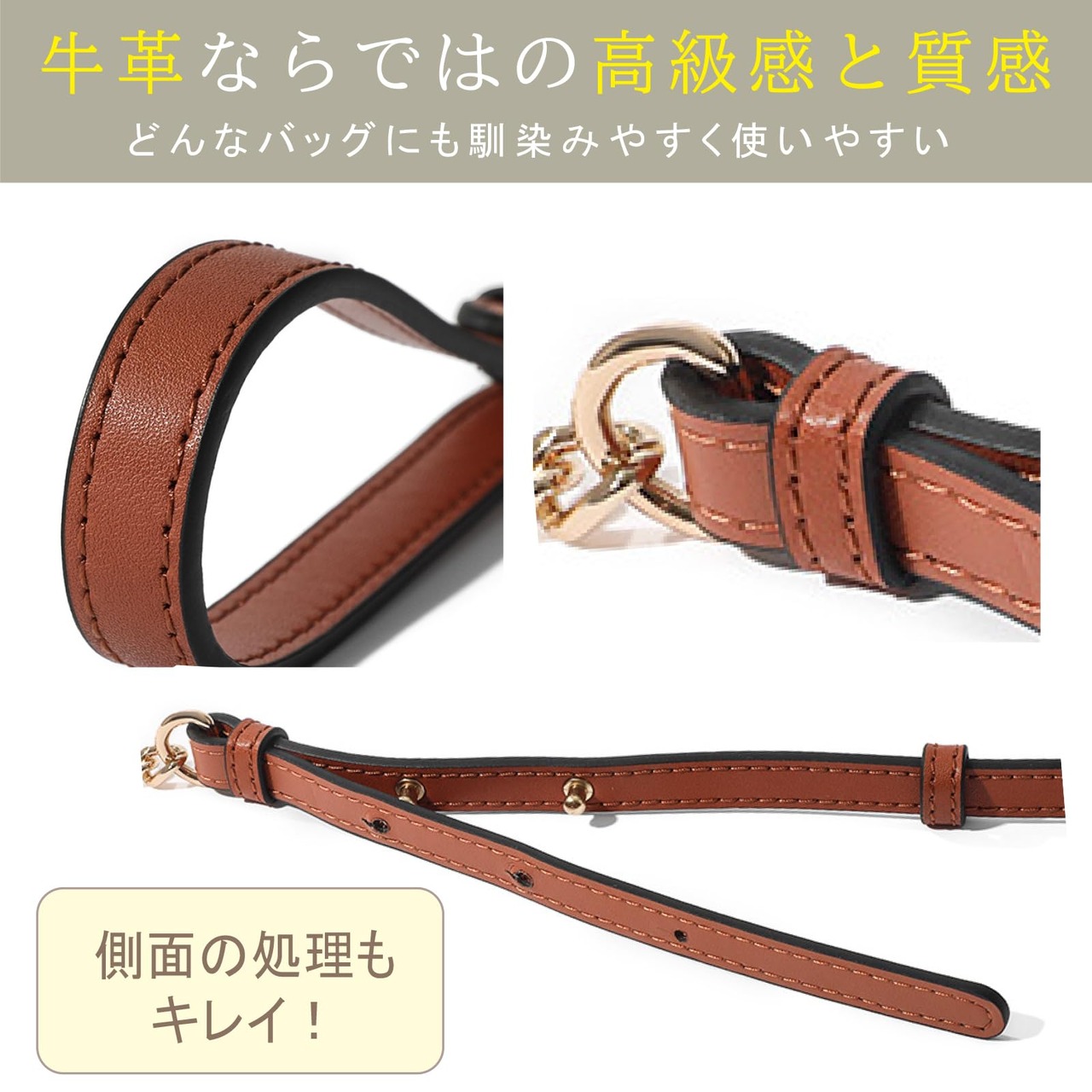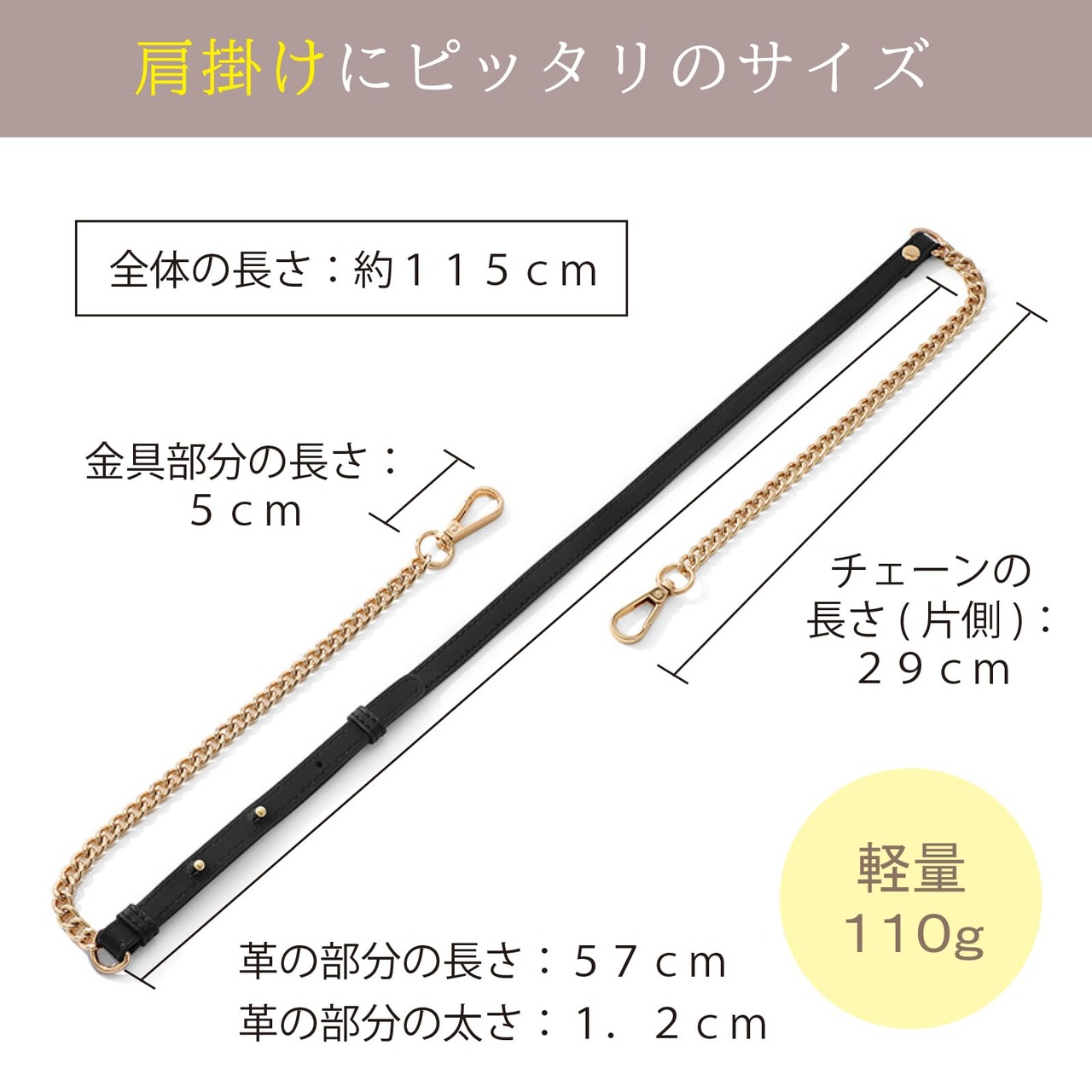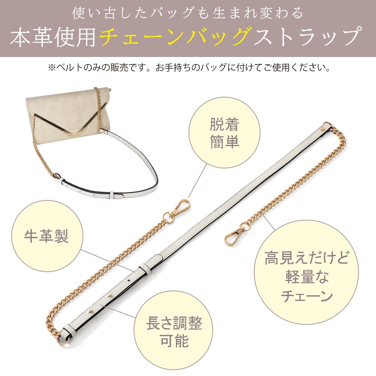 レディースチェーンバッグにぴったりの、交換用ショルダーストラップです。本革使用で高級感があり、どんなバッグにも馴染みます。
