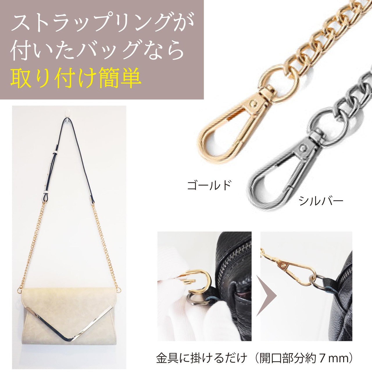 【取り付け簡単】ストラップリング等の金具が掛けられる部分があれば、取り付けは簡単。ベルトの金具を引っかけるだけで装着完了です。一般的なチェーンバッグにちょうど良いサイズで、バッグのデザインや、年齢を問わずご使用いただけます。