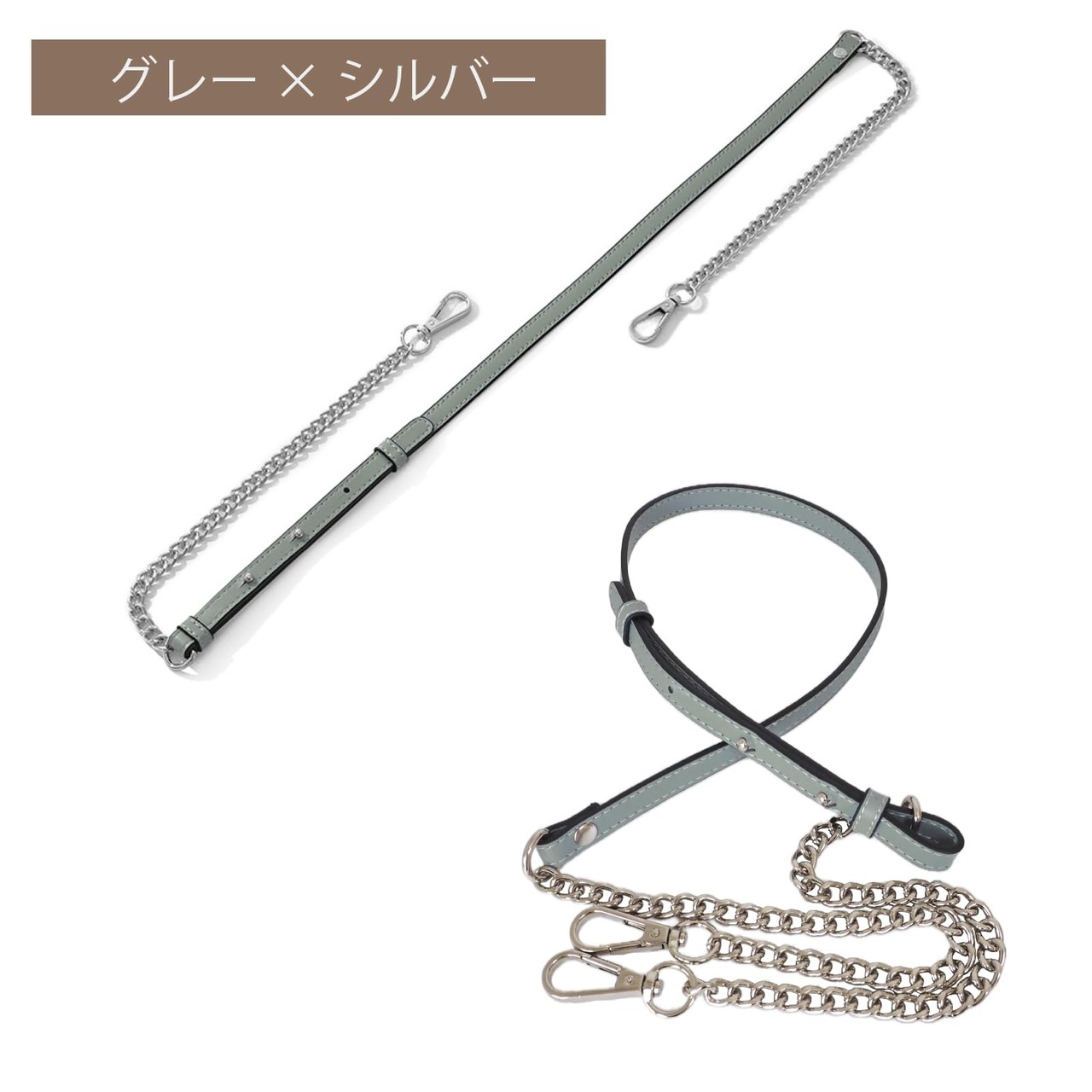 [masamilk] チェーンストラップ 牛革 ショルダーベルト チェーンバッグ用 ショルダーストラップ 細め 交換 単品 (グレー×シルバー)