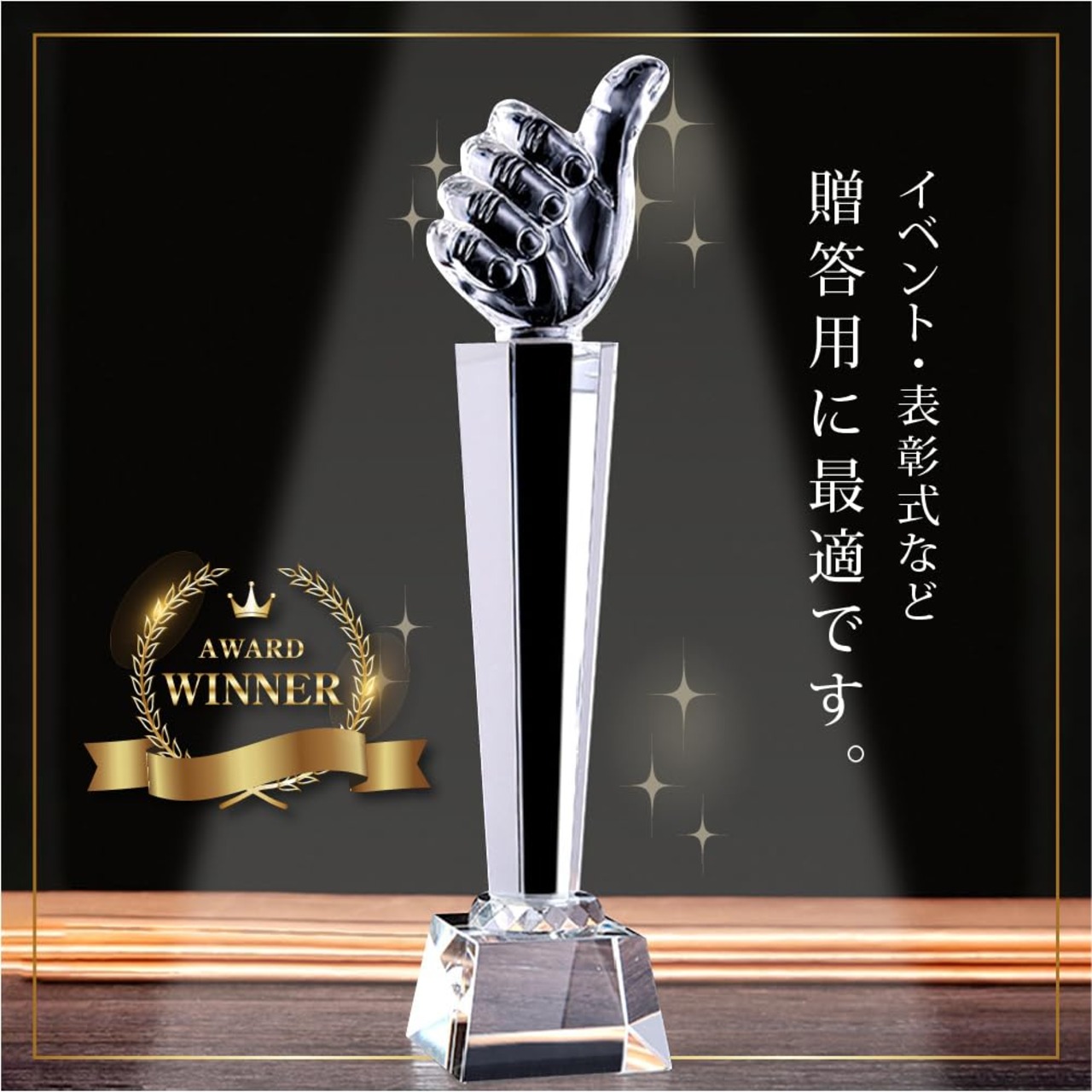 【見た目がゴージャス】人工クリスタルガラス素材が光り輝いているので見た目がゴージャスでインパクトがあります。大会やイベントなどでメダルや賞状と一緒に優勝者に渡してもとても喜ばれます。いいねマークの面白いトロフィーは老若男女問わずその場を楽しく盛り上げてくれます。