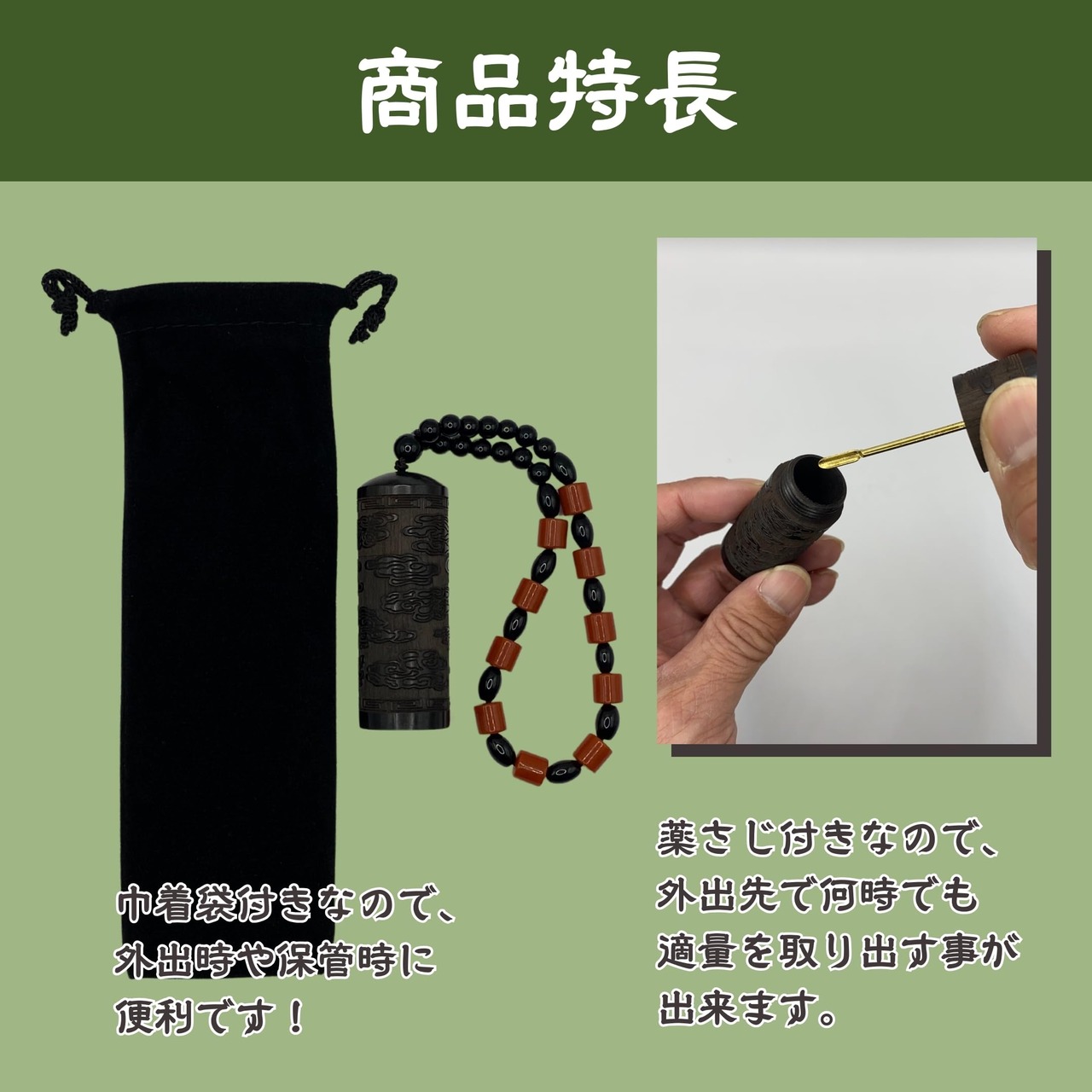 ✅落ち着いた風合いの黒檀で仕上げられたこの塗香入れは、参拝時の必需品を洗練されたスタイルで持ち運びできる逸品です。✅コンパクトサイズで、持ち運びにも便利です。巾着袋付きで、中身がこぼれる心配なく運ぶことができます。✅薬さじも付属しており、清めの儀式に欠かせない塗香を取り扱う際にも安心。✅手首用ハンドストラップ付きのデザインで、落下の心配なく参拝に集中できます。✅参拝の際だけでなく、日常使用にも適したこの塗香入れは、使うほどに手になじむ黒檀の味わいをお楽しみいただけます。