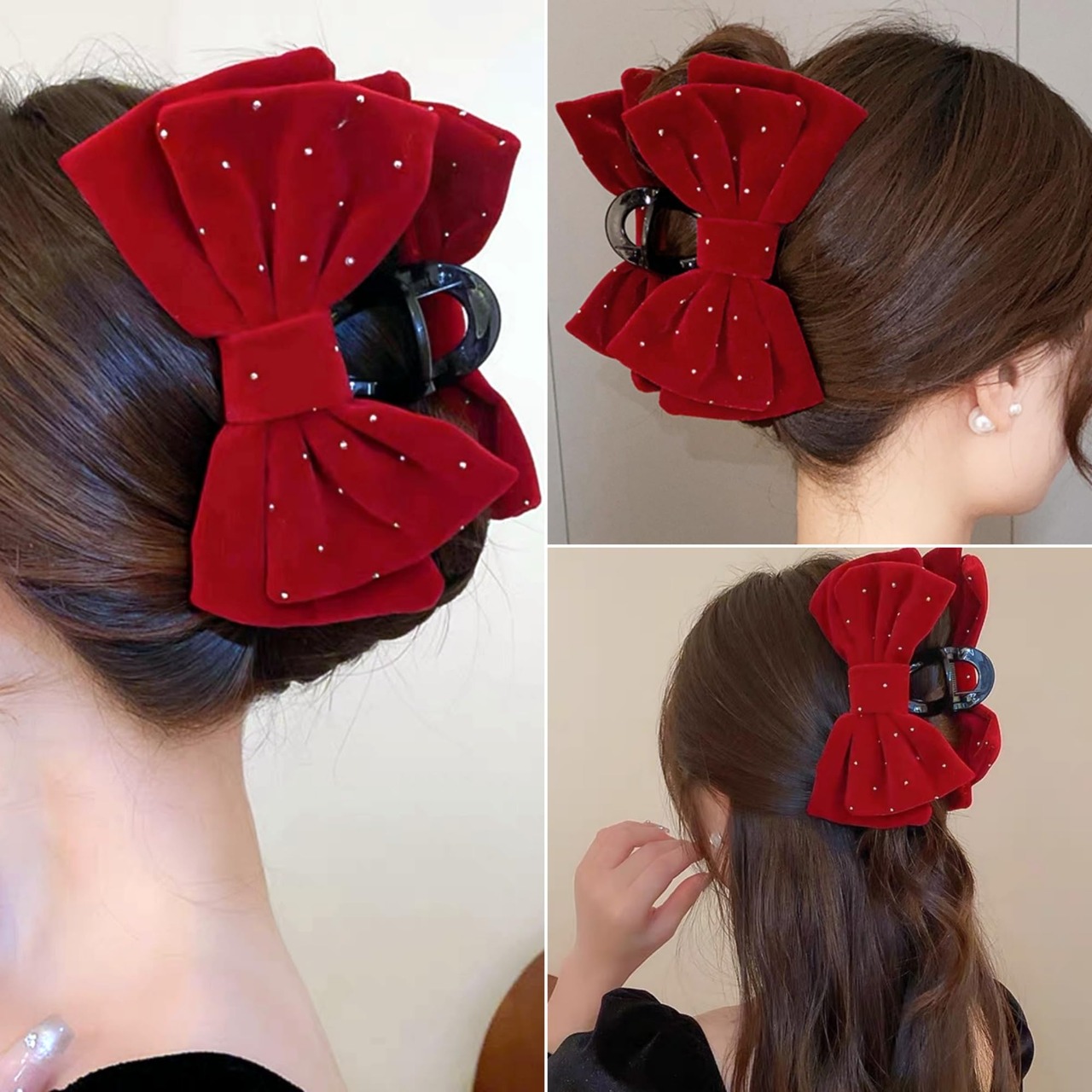 大きなリボンヘアクリップ レディース 大きなリボンクリップ ラインストーン ノンスリップ ジョークリップ 女の子用 ベルベット リボン ヘアクリップ バレッタ パーティー用ヘアアクセサリー (2個パック)