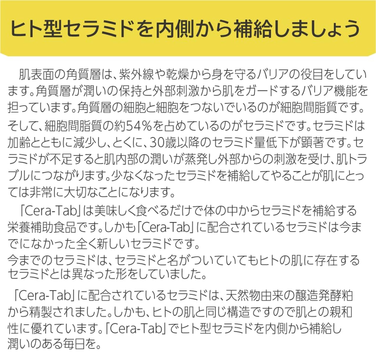 「Cera-Tab(セラタブ)」に配合されている天然ヒト型セラミドは世界初の天然醸造発酵物から高純度精製したセラミドです。(特許第5013348号) ■天然ヒト型セラミドは、醸造発酵物から精製されているため、ヒトの肌に本来存在するセラミドと同じ構造を持ちます。 そのため、細胞間脂質にぴったりと馴染んで、効果的に機能します。 また、天然ヒト型セラミドには長い分子種と短い分子種のセラミドが多く含まれています。 ■天然ヒト型セラミドが配合している製品は、肌のバリア強化や保湿、ツヤを求める方、エイジングケア重視者、環境に配慮した製品を希望する方、美容サロンの効果を自宅で得たい方におすすめです。