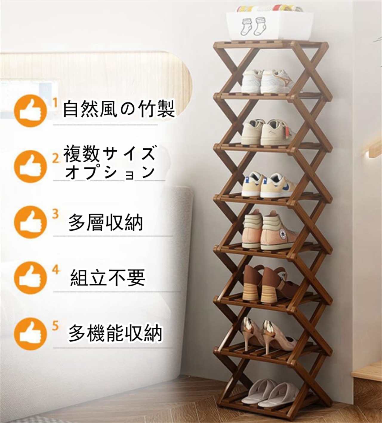 シューズラック 玄関 スリム 靴棚 折り畳み 靴箱 靴収納 下駄箱 靴入れ 省スペース 組立不要 竹製 コンパクト おしゃれ 便利 すき間 幅26cm 屋内 屋外 多用途