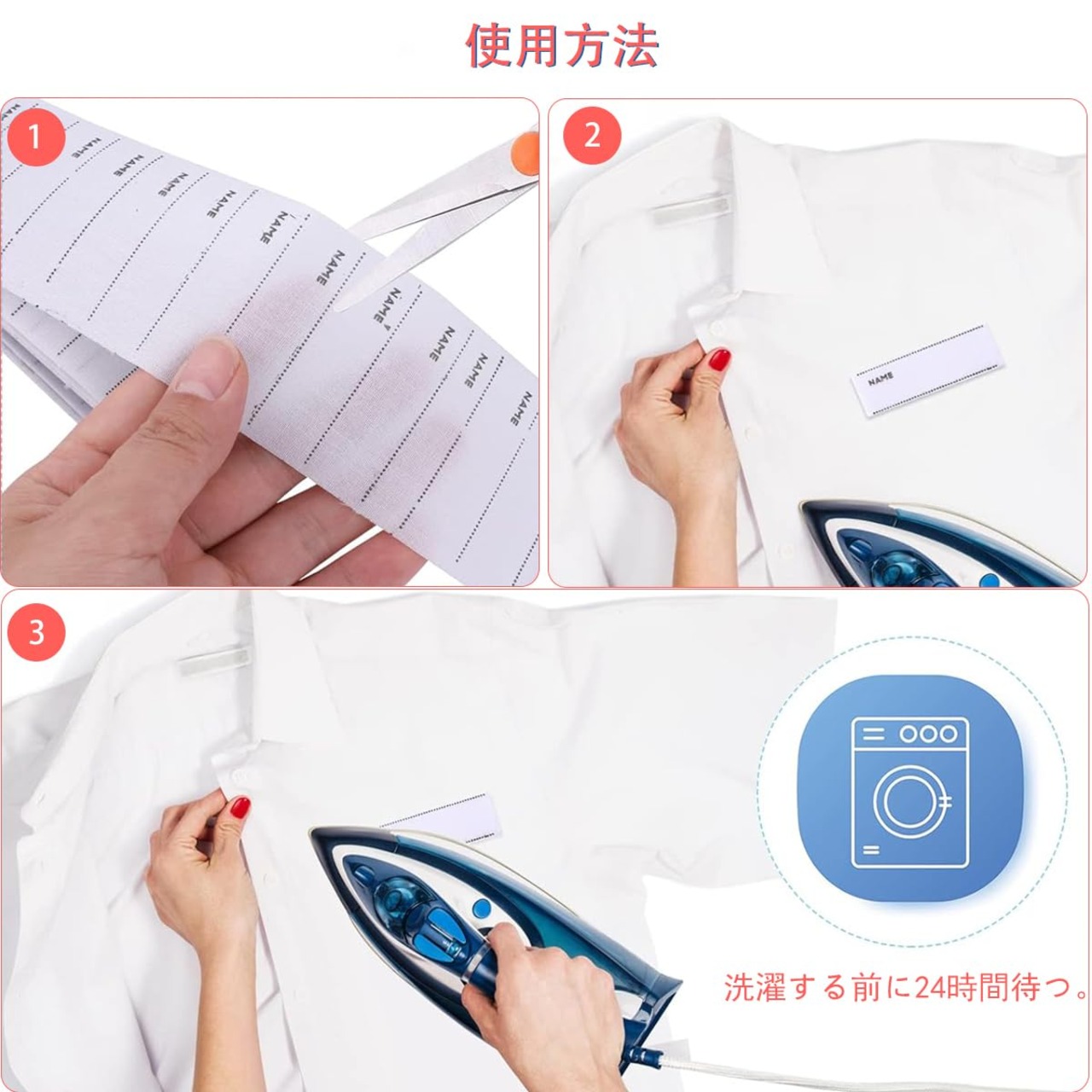 [使用方法]名前布テープは使用する方法は2つあります。 1つ目はドライアイロンを使って約15秒アイロンをかけ、 裏面に接着剤があります。2つ目は、縫製ツールのある任意の位置にラベルを縫うことです。 名前布テープは、希望のサイズに自由にカットできます。これは非常にシンプルで、使用するのに便利です。