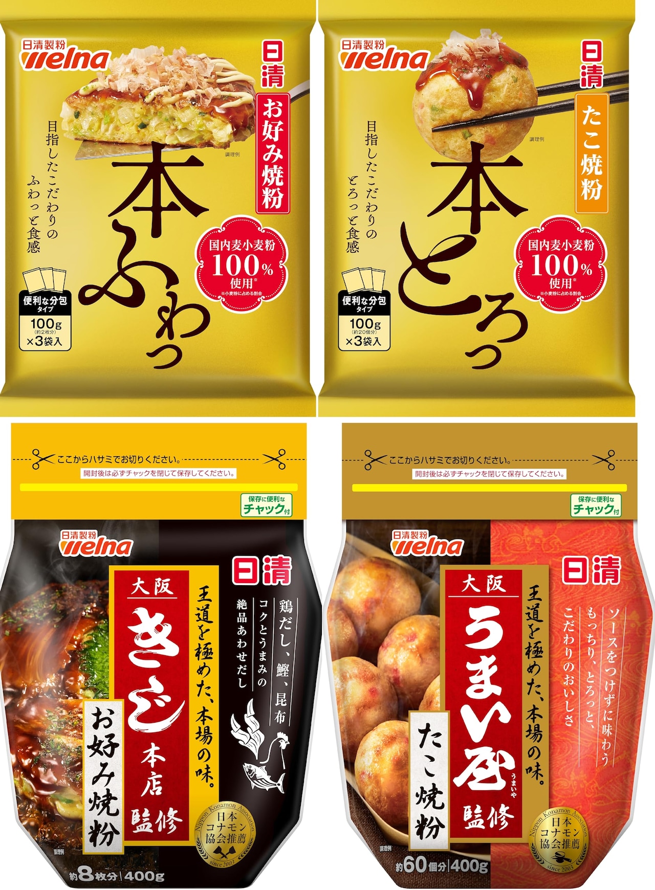 【Amazon.co.jp 限定】日清 国内小麦粉100%使用したふわとろ食感を楽しむ&名店監修を楽しむ お好み焼粉・たこ焼粉食べ比べセット(本ふわっお好み焼粉、本とろったこ焼粉、大阪きじ本店監修お好み焼粉、大阪うまい屋監修たこ焼粉)