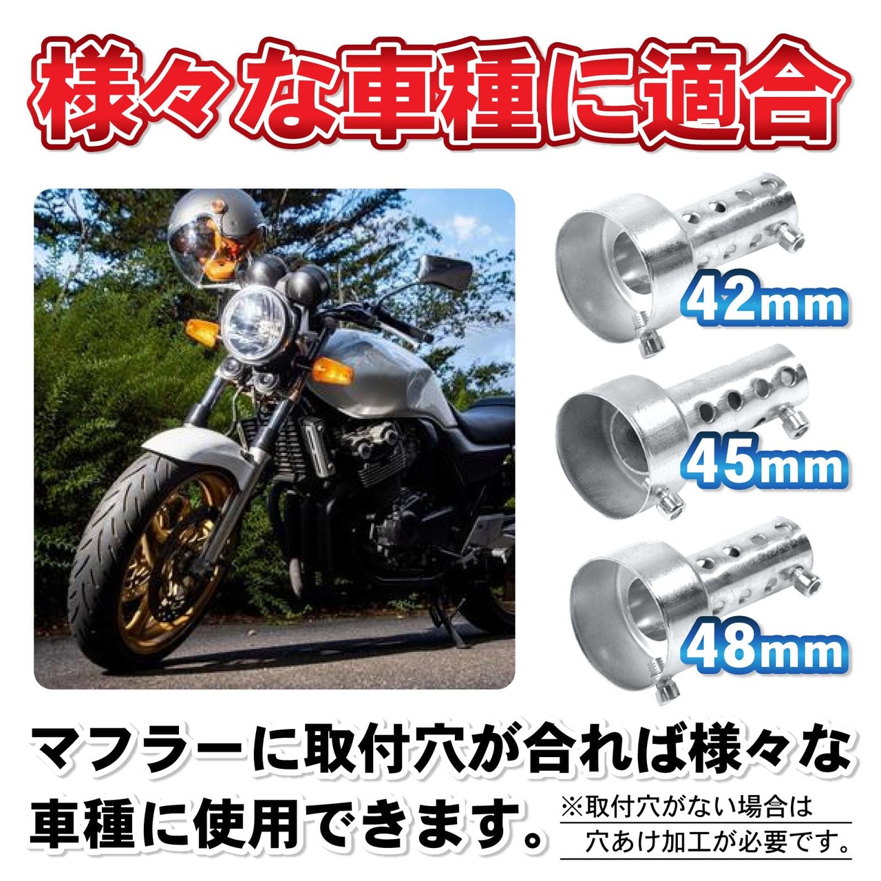 ✅汎用品の為、口径が合う車種には使用可能です。アメリカン、スポーツ、ネイキッド、原付など様々なバイクに使用頂けます。※マフラーにサイレンサー取付用の穴がない場合は、穴あけの加工が必要になります。