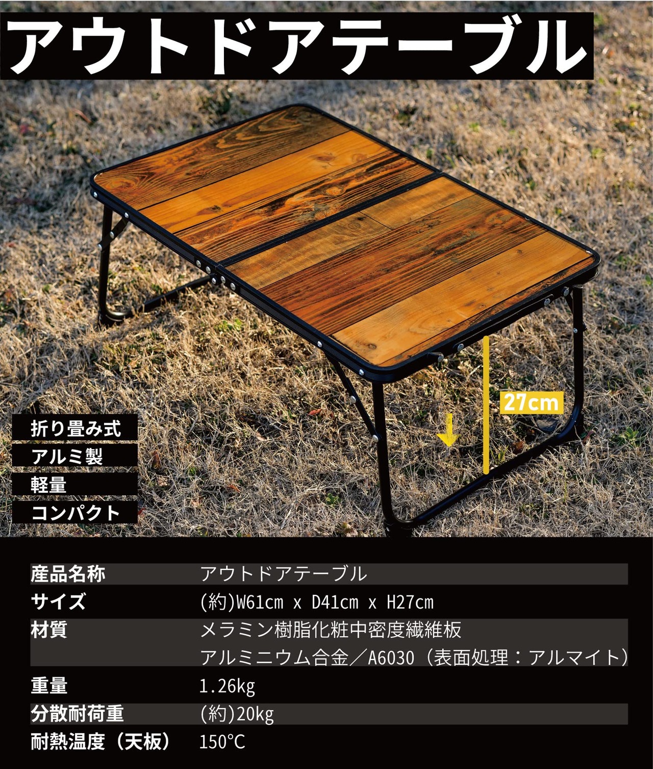 ☆アウトドアや運動会、行楽シーズンに大活躍の折りたたみテーブル。天板のサイズは61cm×41cm、キャンプやお花見、お釣りでは食材やコップ、調理器具が置けるので、1~3人用にオススメです。高さは27cmなので、ロータイプのチェアと合わせて使うのに最適。