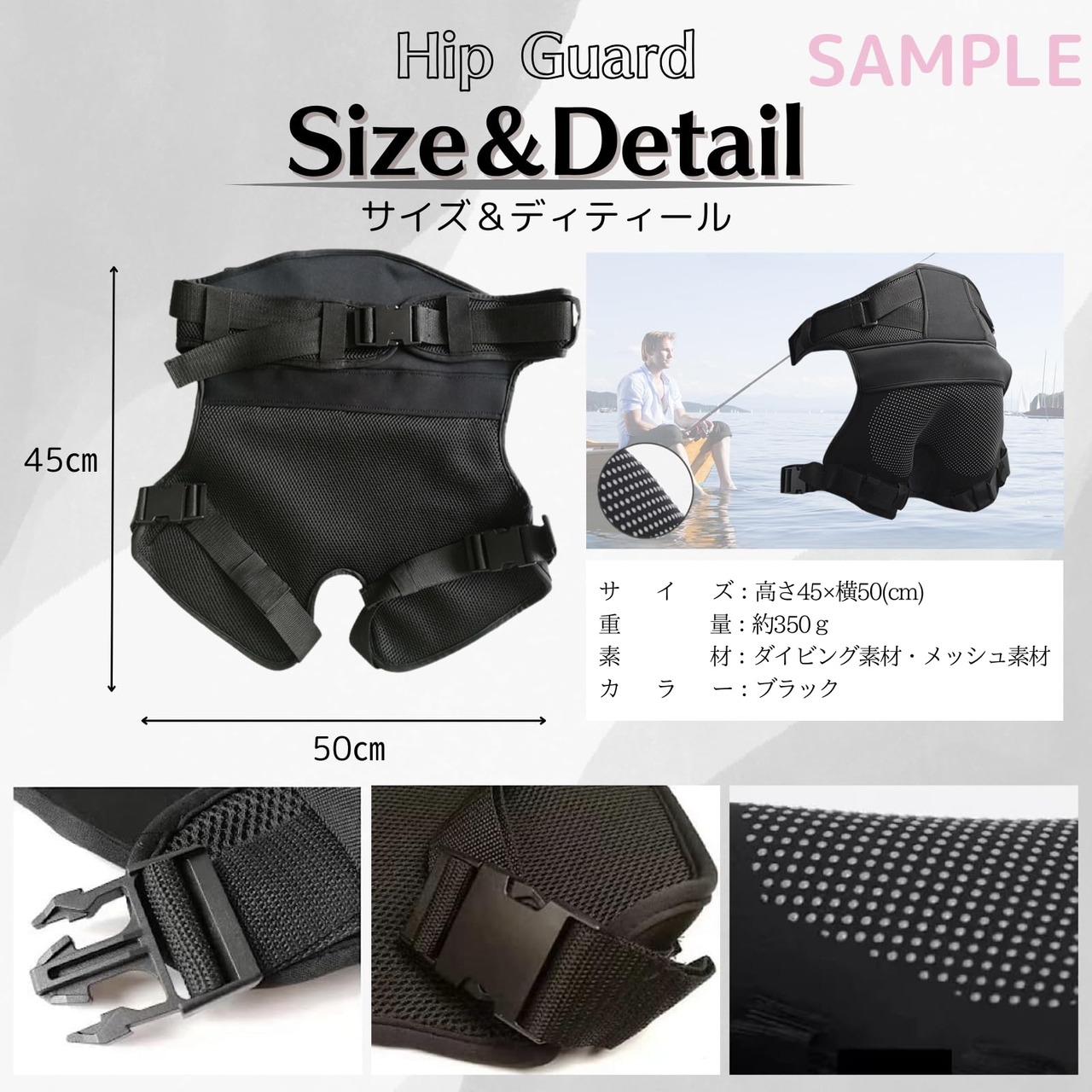 【商品仕様】尻 プロテクター:ダイビング素材とメッシュ素材を使用。商品サイズ:45×50cmのフリーサイズで折りたたみ可能です。ウエストサイズは84~120cmまで調整可能。 重量:約350g カラー:ブラック