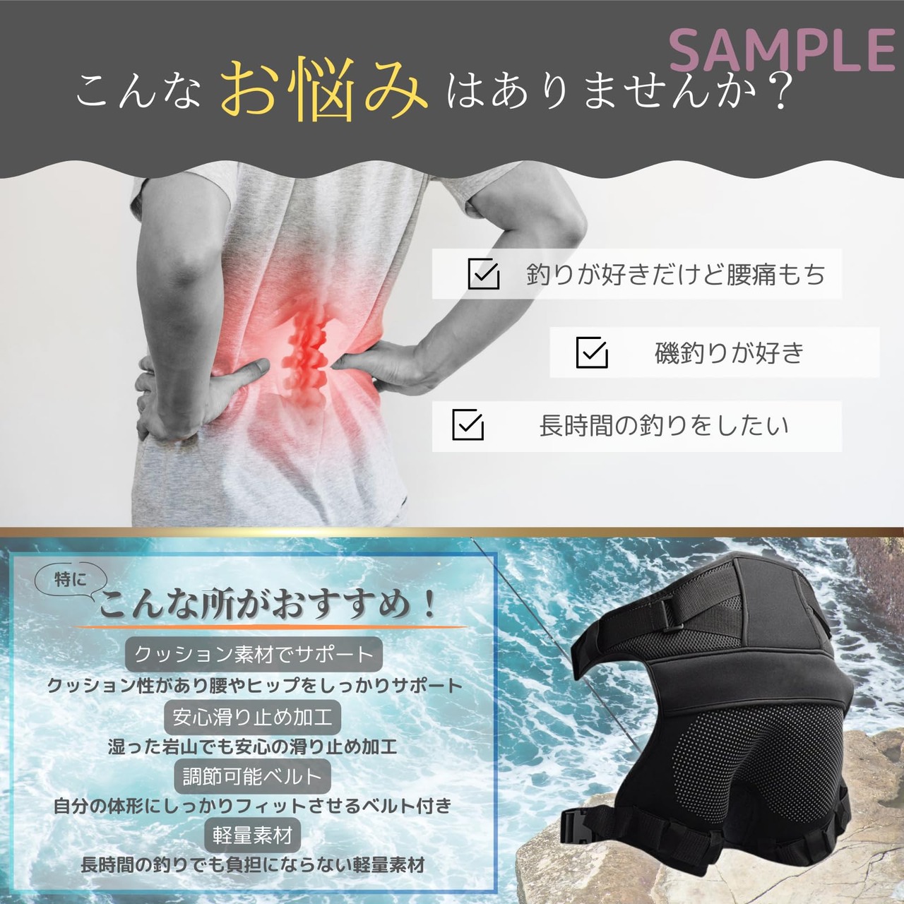 釣りなど 長時間座る際にでる疲労感や痛みを軽減してくれるヒップ用プロテクターです。お尻だけでなく腰のサポートにも適しています。 ダイビング素材とメッシュ素材を使用しており、防水性はもちろんのこと、優れた通気性も実現。さらに表面にはゴム製の滑り止めパットを使用しており、滑り止め効果や 安定した座り心地をサポートします。