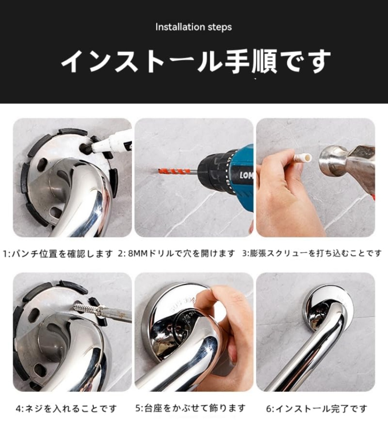 荷重:壁肉厚めたステンレスパイプとネジ止めの仕様を採用し、通常のステンレス製品よりも荷重が60%も大きくなりました。玄関、トイレ、浴室、お風呂様々なところにご安心に使えます。