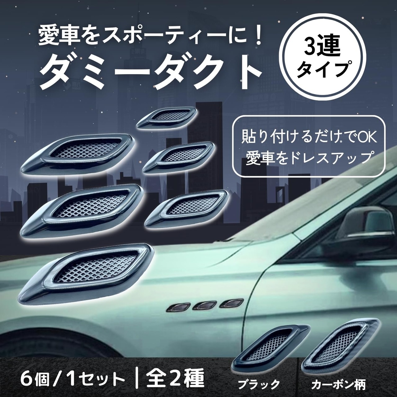 お手軽に愛車のドレスアップができる3連ダミーダクト(フェンダーダクト)になります! 6個セットです。そのまま左右セットの3連ガーニッシュとして、または個別で取り付けダミーのエアロパーツとしてもお使いいただける汎用ドレスアップアイテムです。このガーニッシュアイテムは、小さめアイテムのためお車のサイドやボンネットまたはドア周辺に貼り付け可能です。保護ステッカーとしてもどうぞ!素材は軽量且つ耐久性に優れた高品質ABSプラスチックを使用しています。 カラー:ブラック(黒)、カーボン調 入り数:6個(3個2セット) 付属:両面テープ付き。当商品の両面テープは仮止め用です。必ず脱脂して当両面テープで位置決めした後、お手持ちの強力両面テープでしっかりと固定してください。海外製品のため、多少の擦れや小傷がみられる場合があります。 また、ご覧いただく機種により色合いが異なる場合がございます。個別の適合車種はこちらではお答え出来かねます。予めご了承ください。
