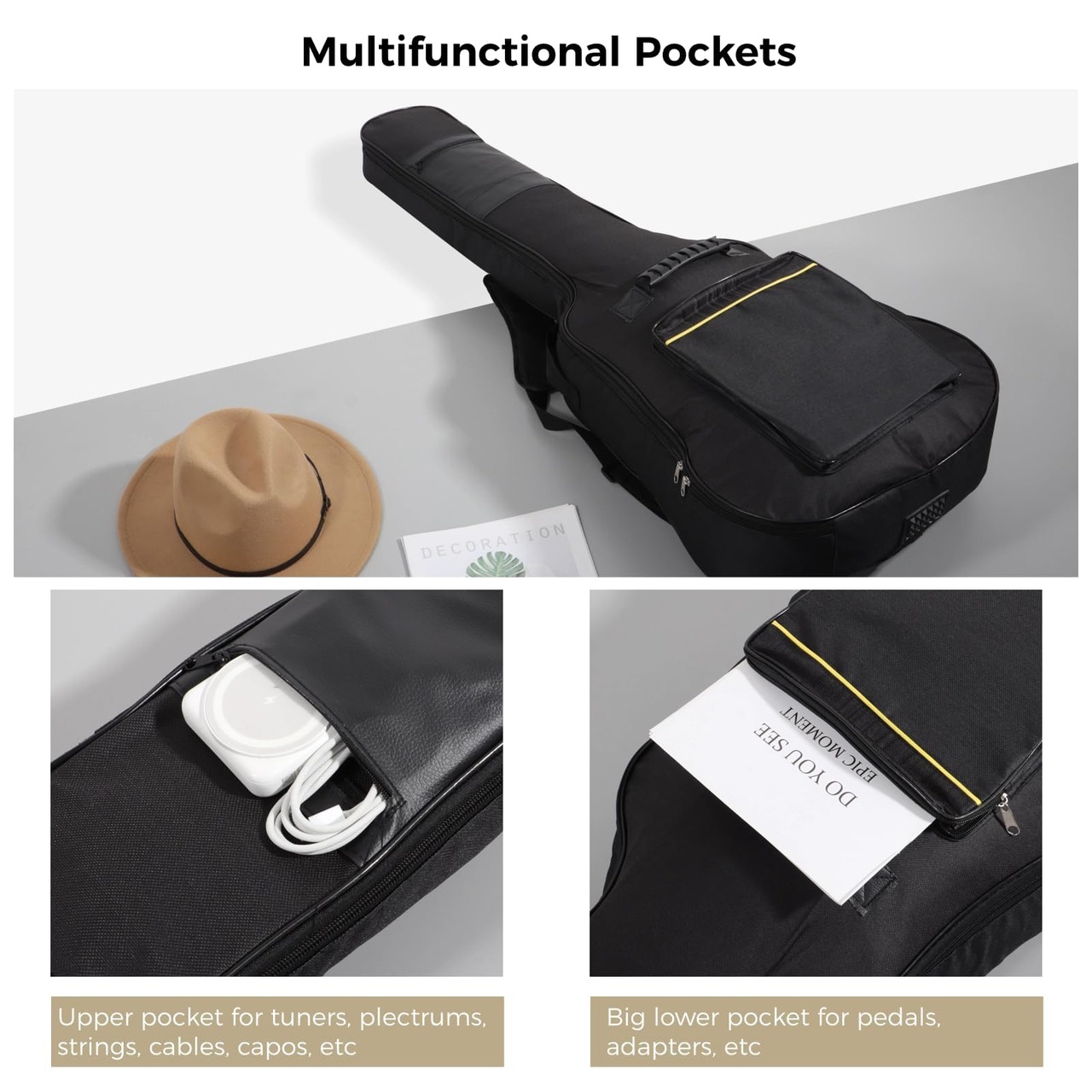 【便利な収納】:ギターバッグの側面とネック部分には小さな収納ポケットがあります。楽譜、ピック、カポ、A4サイズまでを収納可能なメイン・ポケットなどのさまざまなアクセサリーを収納するのに最適で、整理された状態を保ち、必要な時に簡単にアクセスできます。