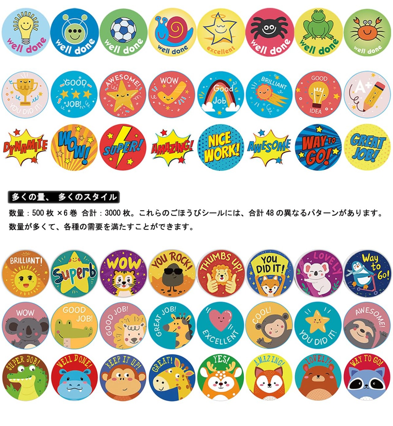 【豊富な絵柄】これらのごほうびシールは合計48種類の異なる絵柄があります。大量に使う需要がある方におすすめ!色やデザインが異なります。ラッピングやお、褒美、手紙、ギフト、カード、いろいろなデコレーションにご利用いただけます。