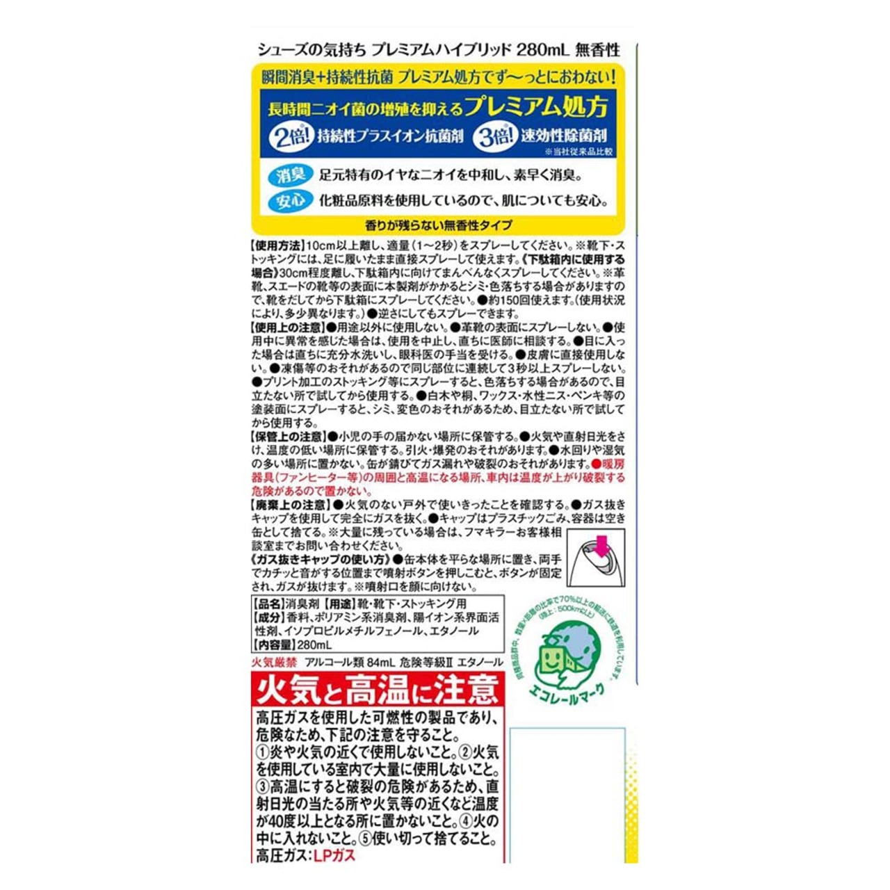 シューズの気持ち 【Amazon限定】【まとめ買い】アルコール除菌 プレミアムハイブリッド 靴用 消臭スプレー 消臭 抗菌 280ml 香りが残らない無香性タイプ×2個+おまけ付き