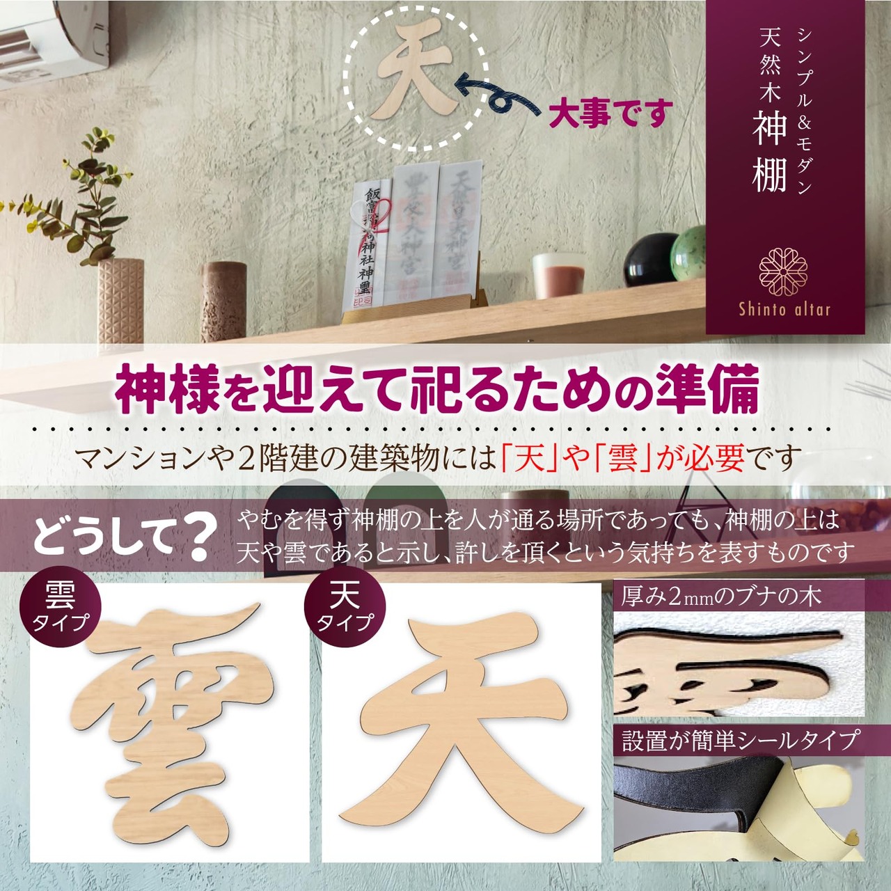 雲彫刻は、神棚と同素材。マンション、アパート、ビルなど神棚の上に2階、3階がある場合に天井に設置します。裏面にはシール付き。神様への敬意を最大限に表せますので、神棚、お札立てと一緒にお祀りしてください。
