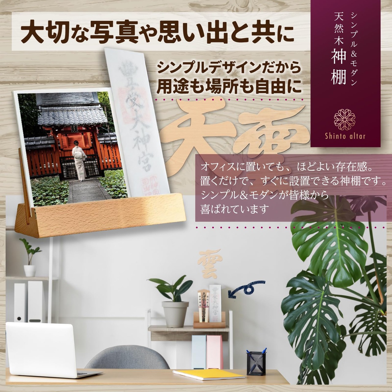 置き型神棚は、お札が3社お祀りできる幅21センチ。目の高さより上の棚や家具の上に置くだけ。壁への穴あけ、天井への固定が不要。賃貸住宅でも使用できます。天然のブナの木使用、優しい色合いでインテリアなじみもよくオシャレ。