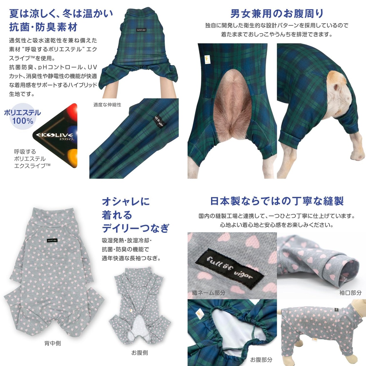 「機能性」と「デザイン」の満足感!インパクトある柄をプリントしたワンランクUP体操服「柄ジャージ」 「機能美」を纏うジャージつなぎの新しい形。 定番のジャージの生地にインパクトある柄をプリント! 日本の縫製、日本の生地。抗菌・防臭・UVカット機能素材で快適な着心地。 通気性の良い素材を使用し、年間を通じて快適に過ごせます。 夏は涼しく、冬は温かい抗菌・防臭素材。 通気性と吸水速乾性を兼ね備えた素材“呼吸するポリエステルエクスライブを使用。 抗菌防臭、pHコントロール、UVカット、消臭性や静電性の機能が快適な着用感をサポートするハイブリッド生地です。 ●本体:クール・デ・ホットエクス(ポリエステル100%) ●日本製:MADE IN JAPAN ●伸縮性(5段階):4 ●厚さ(5段階):2 ●お洗濯について:手洗い又は、洗濯ネットを使用。アイロンは、当て布をして中温。 ファスナー・ボタン・面テープがある商品は、しっかり止めた状態で洗濯をしてください。国内の縫製工場と連携して、一つひとつ丁寧に仕上げています。心地よい着心地をお楽しみください。 漂白剤・柔軟剤使用不可。アイロン・乾燥機使用不可。他の衣類への移染が気になるお客様は淡色衣類とのお洗濯はお避け下さい。 ドッグプレイとはアクティブに動く・遊ぶ・スポーツする・散歩する動きやすさを追求したシリーズです。散歩時の汚れ対策や、ドッグランで思いっきり走ったり、ゴロゴロしたときの汚れの対策、雪遊び時の毛にまとわりつく雪玉対策、海や山での遊び・スポーツの際の汚れ対策など、ワンちゃんのお手入れを楽にします。 コレクション:【2024年春夏新作】