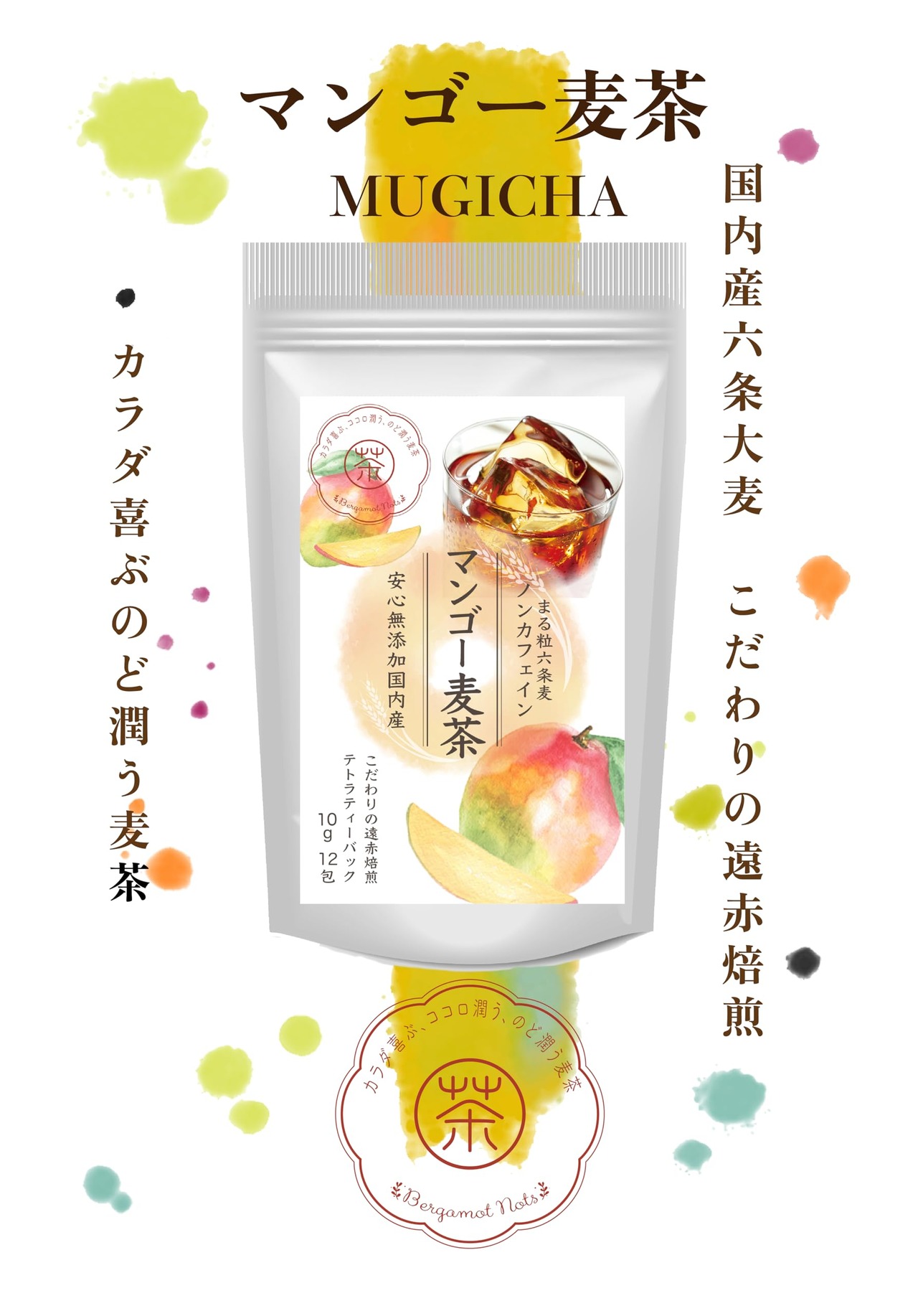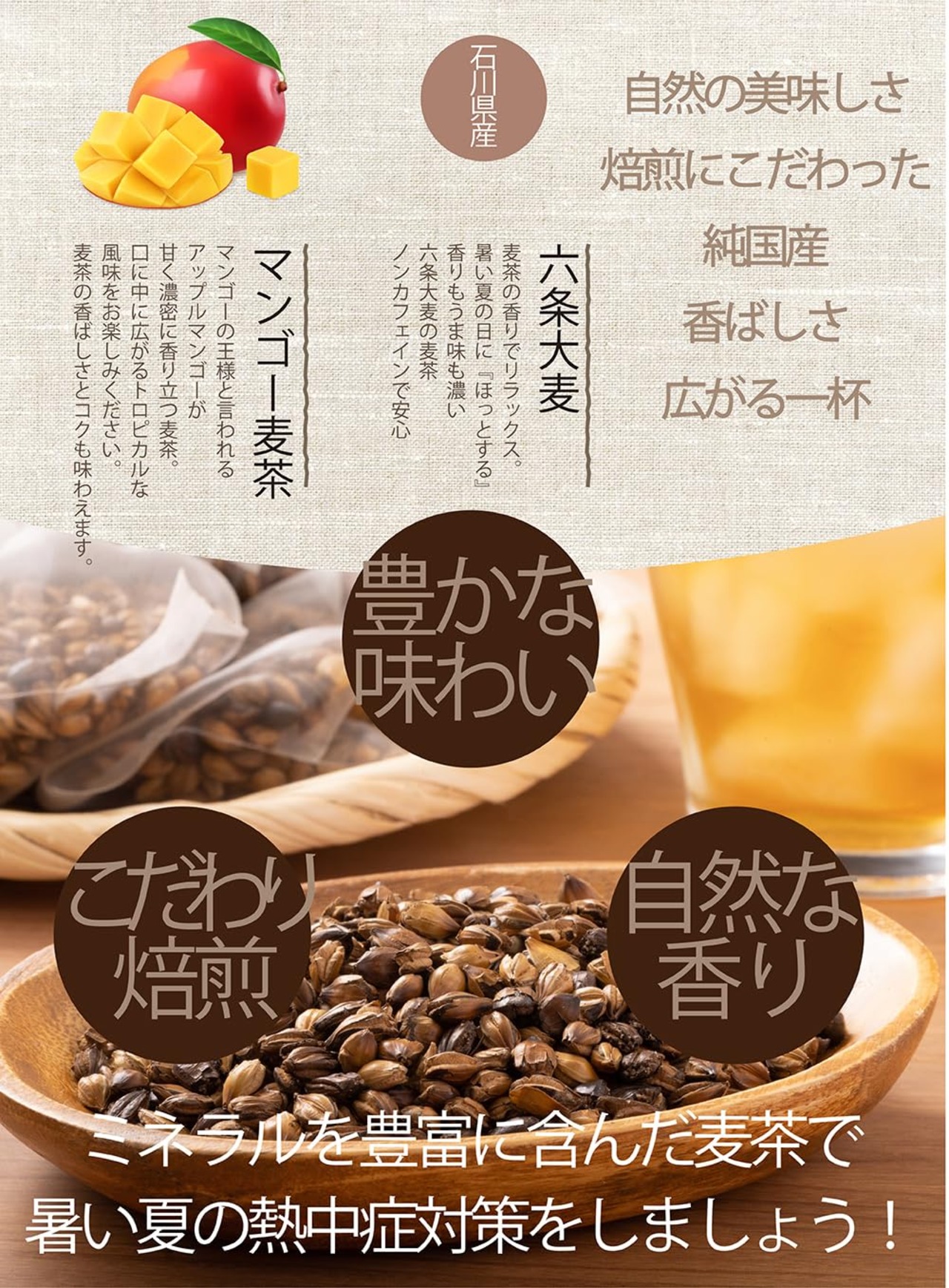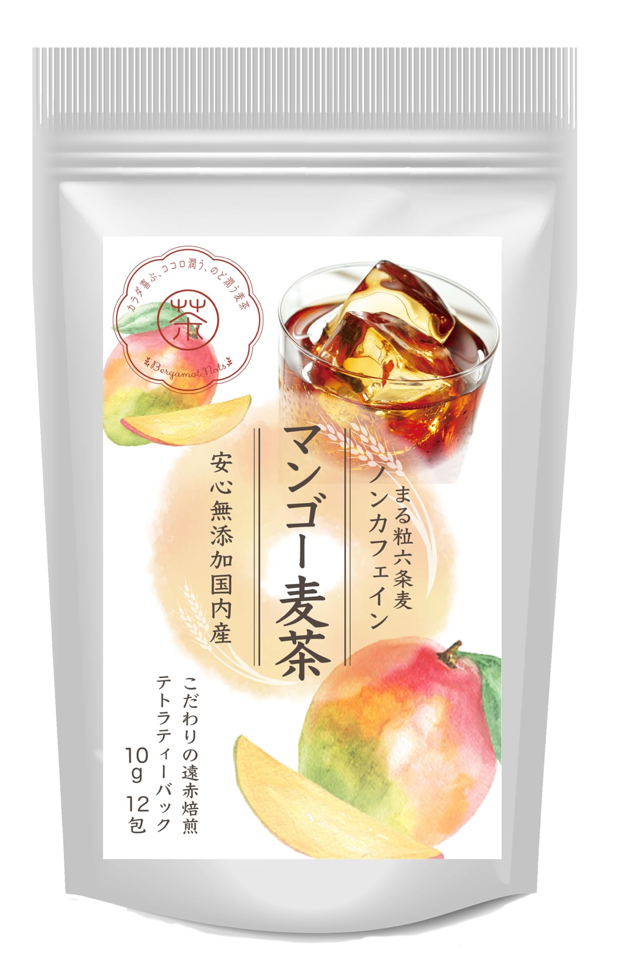 マンゴー麦茶;とろけるような完熟マンゴーをイメージし、上質な六条麦茶にまとわせました。爽やかな味わいは、夏のティータイムにおすすめです。水出し ミネラル豊富 ノンカフェイン・ノンカロリー